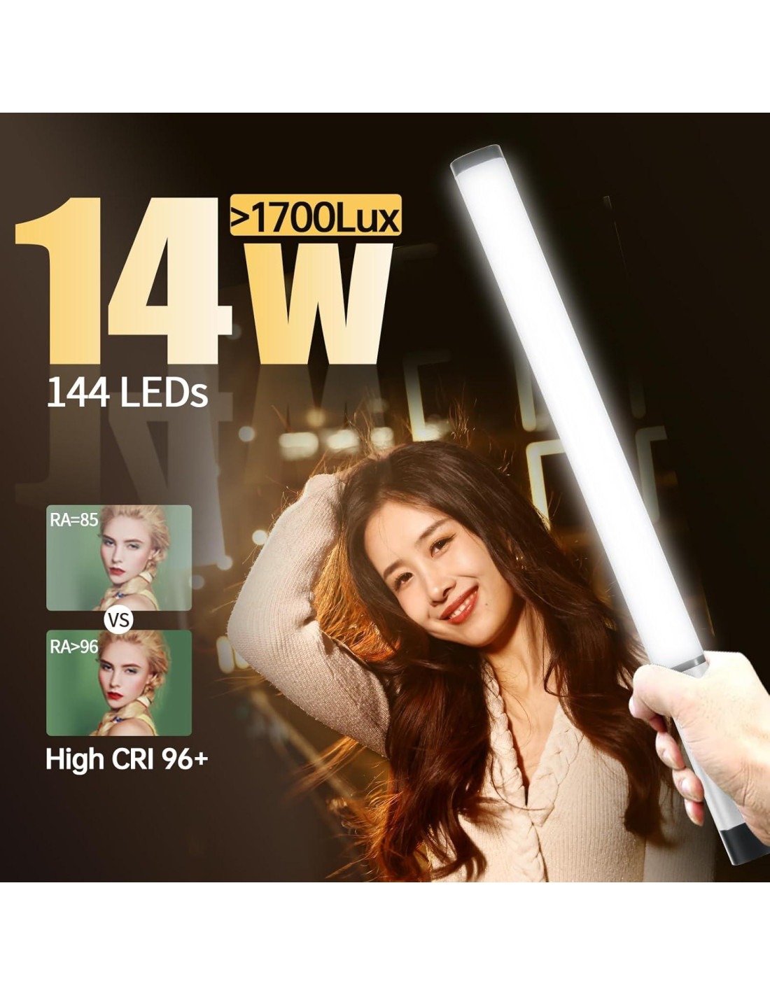- [Varita de Luz Bi-Color Potente] : La varita de luz de video cuenta con 144 LEDs, >1700Lux/0.5m de iluminancia y 16w de potencia. Con un rango de ajuste de brillo del 0-100%, tienes control total sobre tus efectos de iluminación.