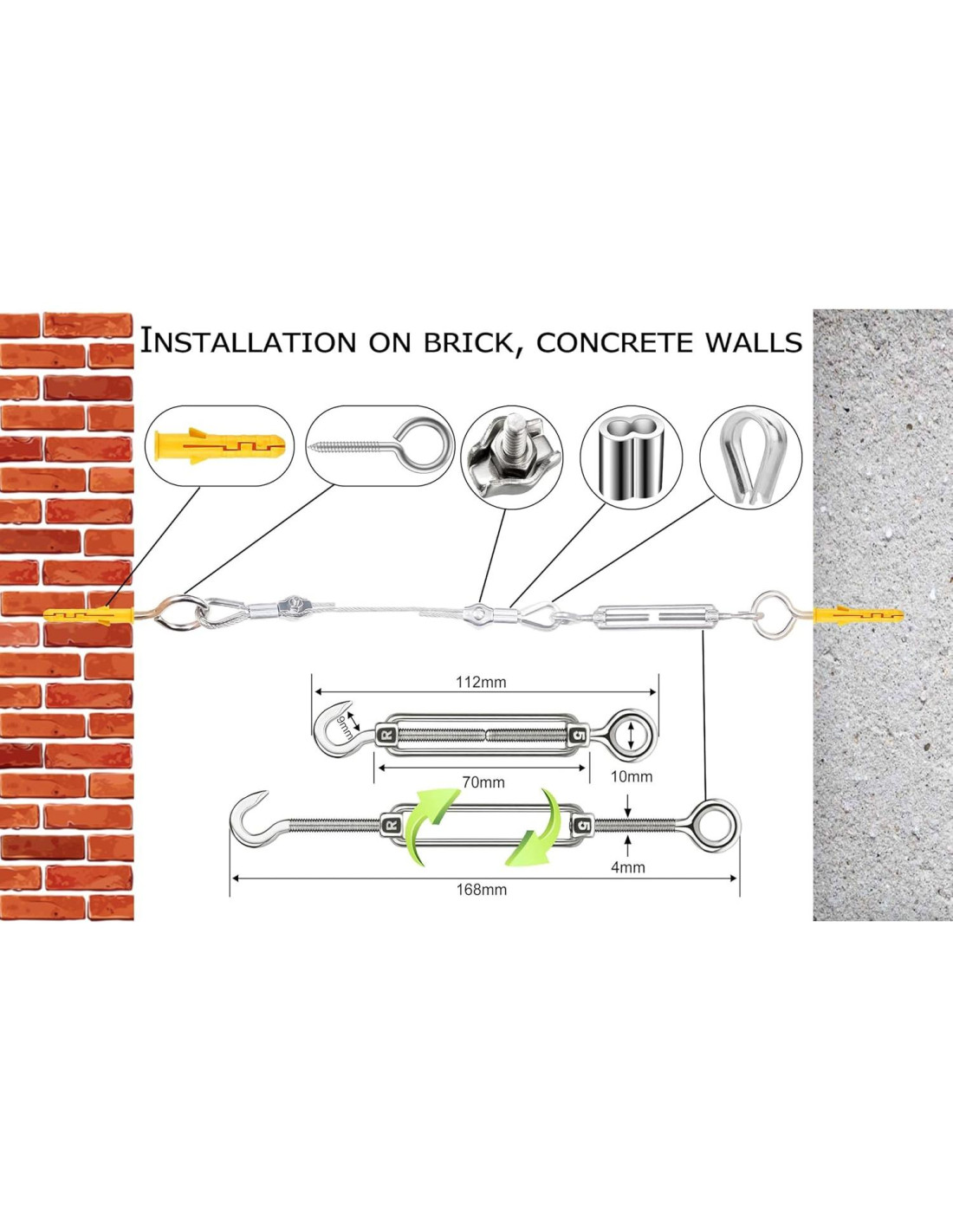 - Kit de Hardware para Velas de Sombra - Incluye 50m (165FT) Cable de Alambre Recubierto de PVC, 6PCS gancho tensor M5, 12PCS dedales de alambre M2, 12PCS ganchos de ojo de tornillo M5, 32PCS bucle de crimpado de aluminio M2, 4PCS gancho de expansión M6, 4PCS gancho de carabina M5, 12PCS anclaje de pared 8*40, 12PCS abrazadera de alambre M3.