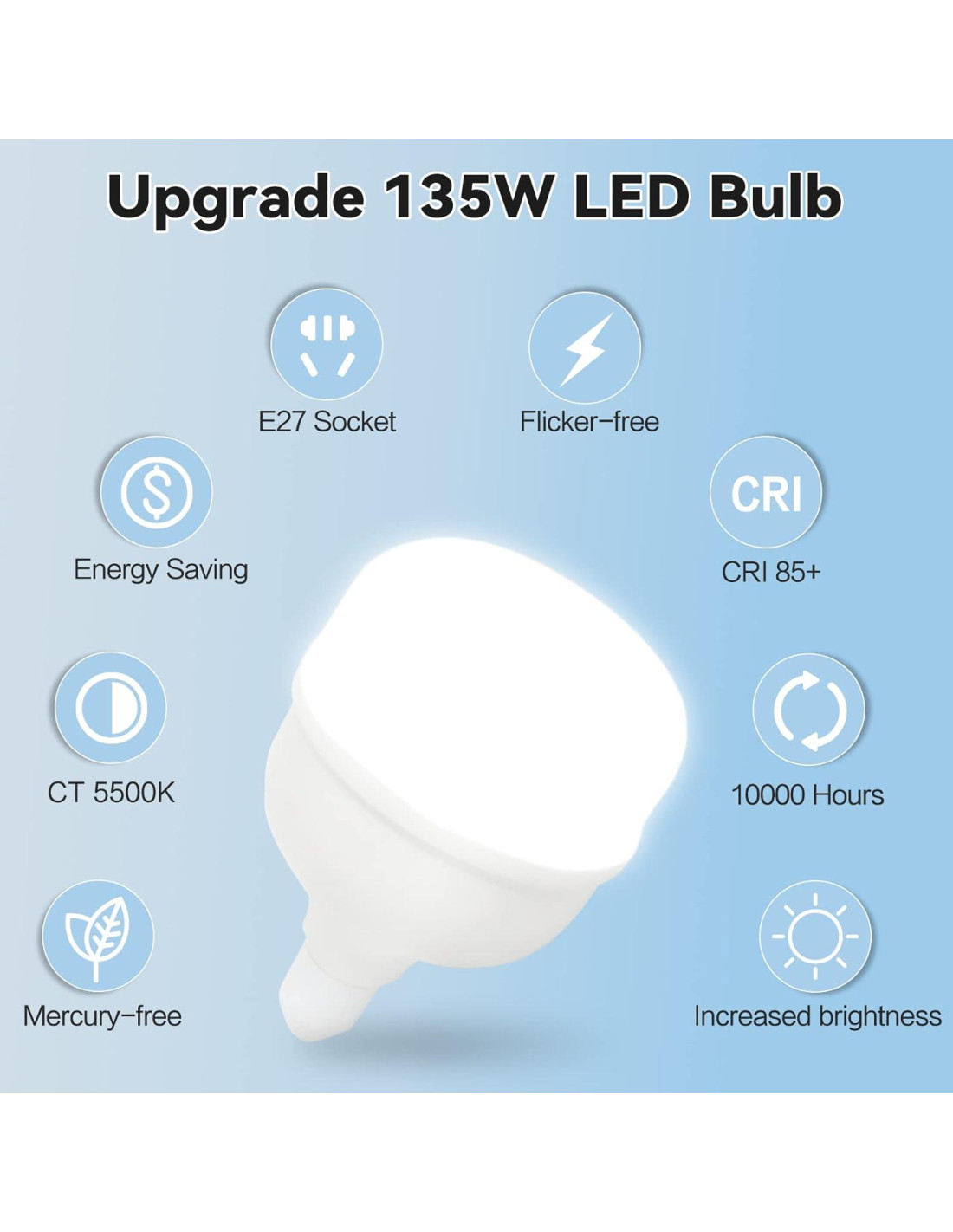 - Bombillas LED de 135W mejoradas: 2 x 135W 110V-240V 5500K bombilla LED de luz diurna, más brillante y ecológica sin mercurio. Salida total equivalente a 1350W de bombilla incandescente regular, ahorro de energía de hasta 80% y vida útil de aproximadamente 10000 horas.