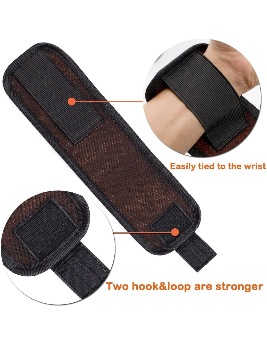 - Fácil de usar-Ponga su mano dentro del lazo elástico preposicionado en el cinturón de herramientas magnético para muñeca antes de envolverlo. Es simple de usar y su conveniencia se incrementa. Puede insertar ciertos componentes no magnetizados, incluyendo cobre y aluminio, en dos bonitos compartimentos.