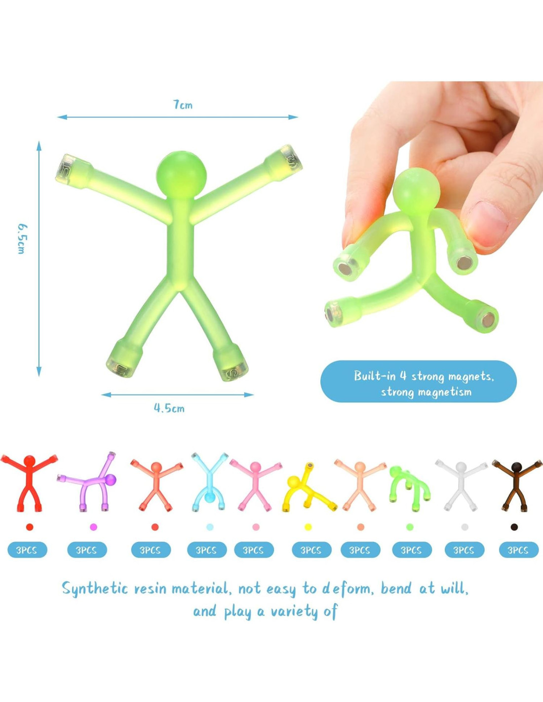 Características: Más colores para elegir: Los imanes de fidget tienen una variedad de colores, y puedes crear tus propias obras artísticas según los colores, como decoraciones para fiestas y festivales, dejarán una profunda impresión en los invitados. Uso extenso en la vida diaria: Estos juguetes magnéticos humanoides se pueden aplicar como imanes de nevera, imanes de pizarra, imanes de cartelera, etc., adecuados para uso en el hogar y la oficina. Especificaciones: Material: resina sintética e imanes Color: como se muestra en las imágenes Tamaño: aproximadamente 7 x 7 cm (2.76 x 2.76 pulgadas) El paquete incluye: 30 x juguetes magnéticos coloridos Notas: Medición manual, por favor permite ligeros errores en el tamaño. El color puede tener una ligera diferencia debido a diferentes pantallas. Los productos son adecuados para personas mayores de 6 años.