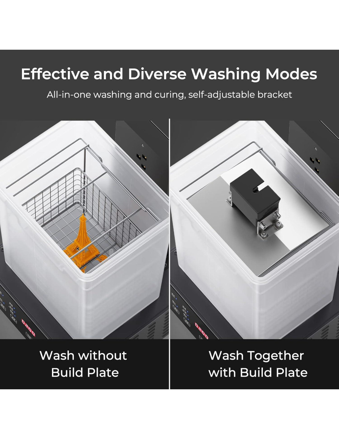 - Múltiples Funciones y Soporte Autoajustable: Modos de lavado efectivos y diversos. Adecuado para la mayoría de las plataformas de impresión de resina. Flexible en el eje z, se adapta al modelo con el nivel de agua.