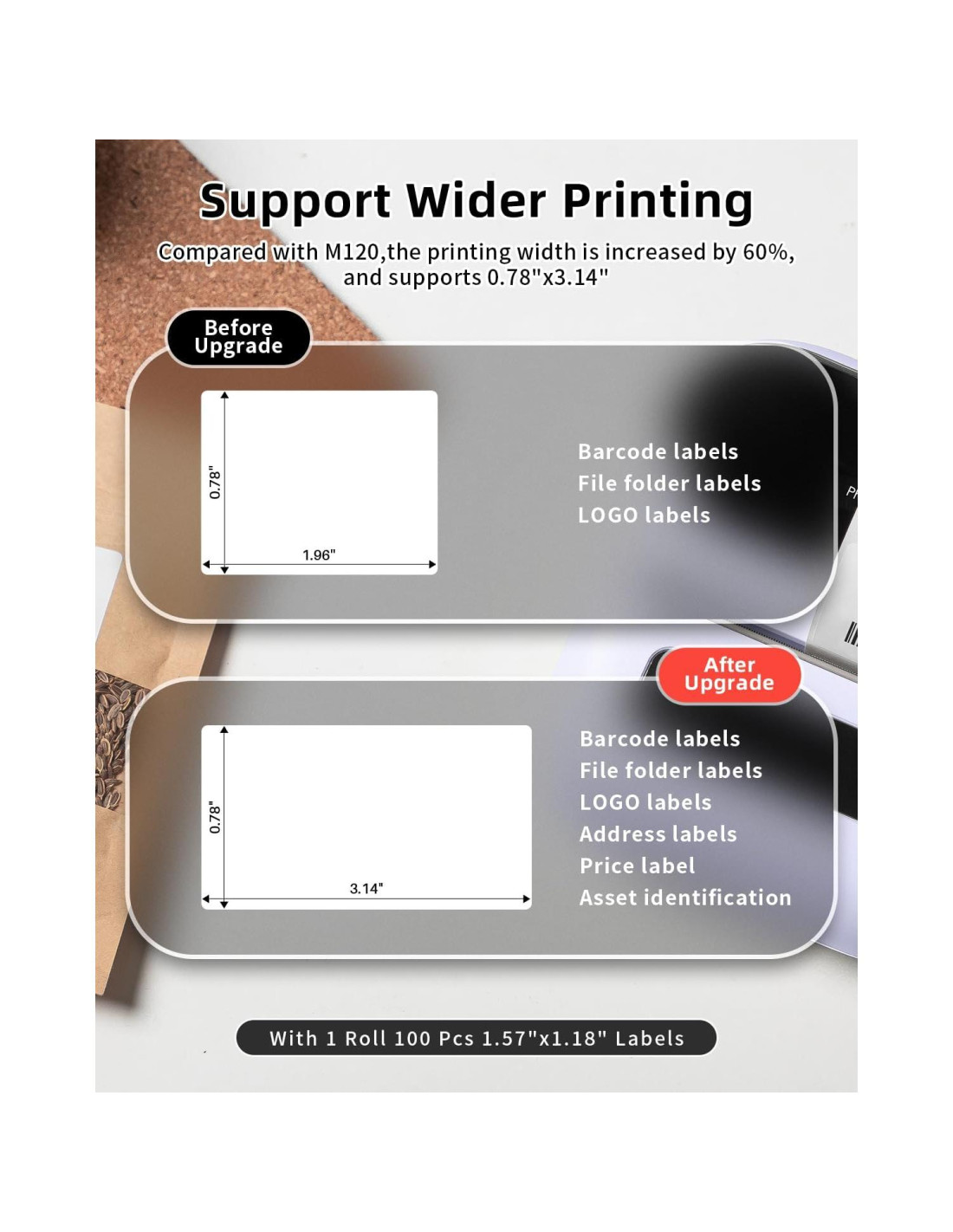 - Nuevo Buque Insignia de Phomemo - La impresora de etiquetas Phomemo M220 adopta la cabeza de impresión Roma de Japón, nuevo ancho de impresión mejorado de 20-80mm, admite la impresión de etiquetas más anchas y de más tipos; como código de barras, tarros, precios, ropa, QR, icono, también puede imprimir etiquetas de dirección, etiquetas de ingredientes, etiquetas de envío. Te ahorra mucho tiempo escribiendo a mano etiquetas y mejora la eficiencia. (la impresora de etiquetas no admite etiquetas de 4 "x 6").