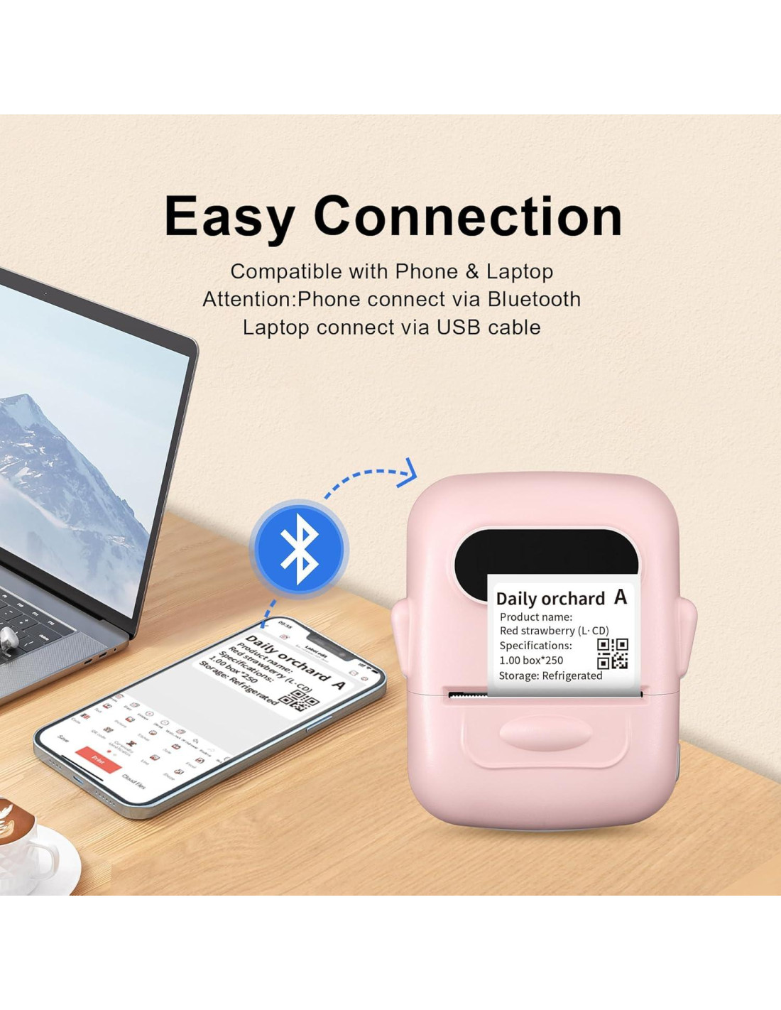 - [Impresora de Etiquetas de Código de Barras Bluetooth] La impresora de etiquetas térmica P50 tiene conexión inalámbrica Bluetooth. Conéctate rápidamente a tu smartphone en 2 segundos a través de Bluetooth 4.0, la impresora de etiquetas Bluetooth logra una impresión conveniente, fluida y rápida a 10 metros de distancia del smartphone.