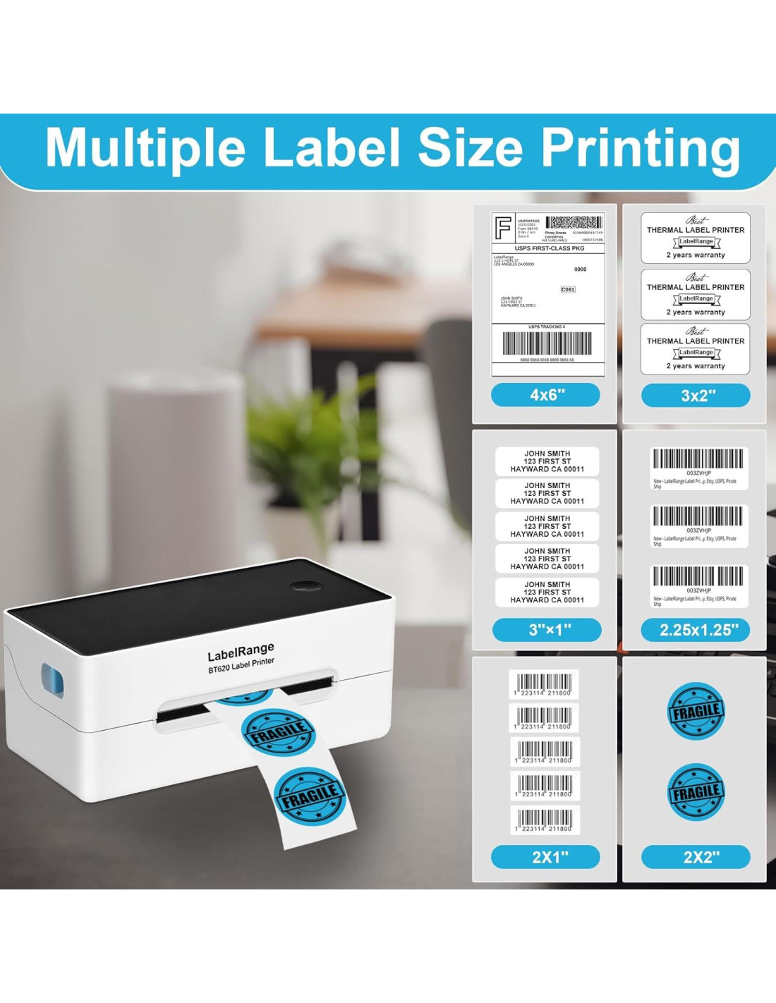 - MEJORA TU JUEGO DE IMPRESIÓN DE ETIQUETAS: La impresora de etiquetas BT620, diseñada con tecnología térmica directa, elimina la necesidad de costosos cartuchos de tinta, tóner o cintas. Soporta etiquetas térmicas directas y puede imprimir etiquetas que van de 1.5 a 4.1 pulgadas de ancho y de 1 a 9.5 pulgadas de alto. Esta versatilidad la hace perfecta para varios tipos de etiquetas, incluyendo etiquetas de envío de 4x6", etiquetas de comida de 3X5'', etiquetas de productos de 3x2", etiquetas de dirección de 3x1", etiquetas redondas de 2x2", etiquetas de código de barras UPC de 2x1" y más.
