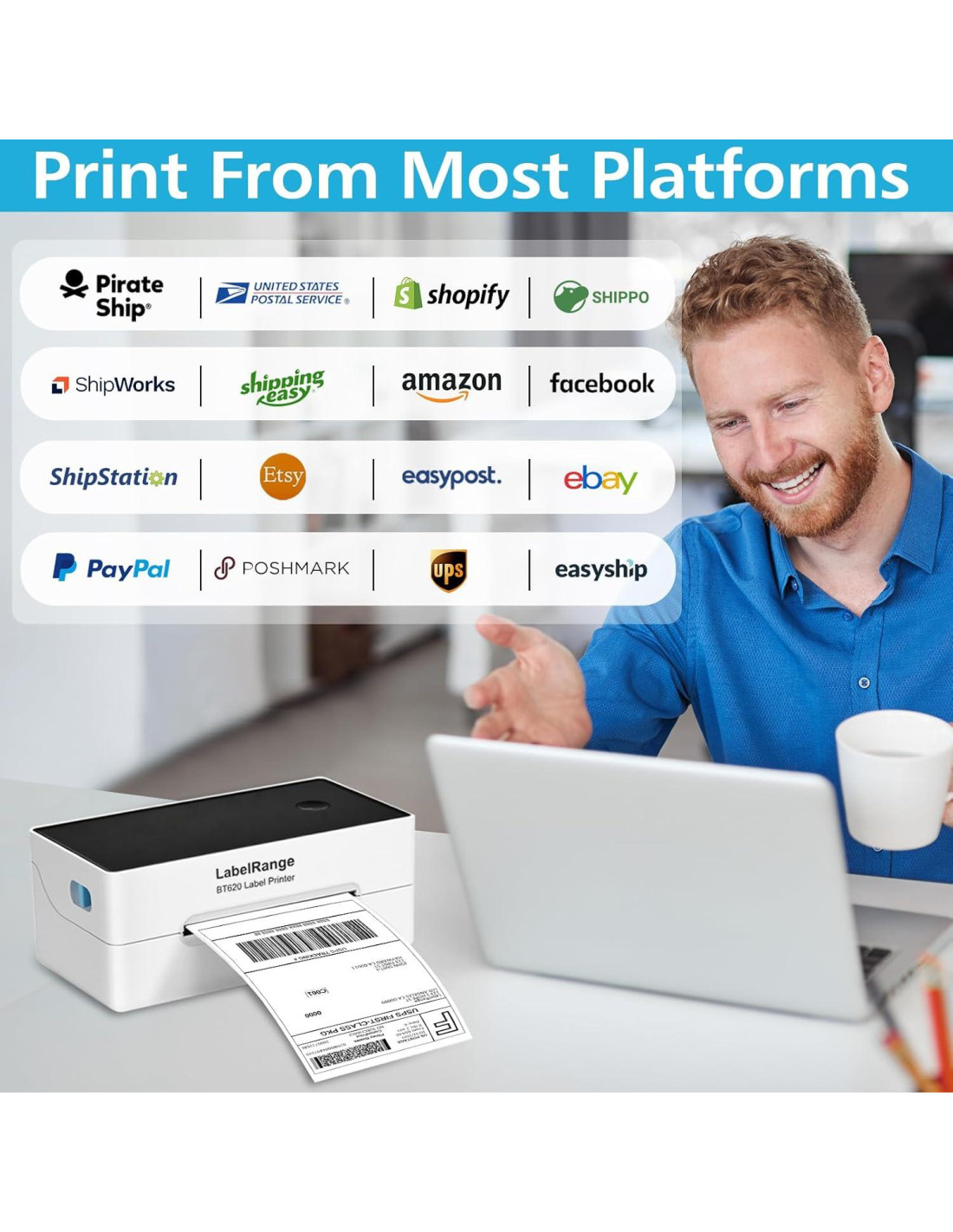 - LLEVA TUS PROYECTOS DE ETIQUETAS A DONDE QUIERAS: Esta impresora de etiquetas de envío Bluetooth puede trabajar con todas las principales plataformas de envío, incluyendo USPS, UPS, Shippo, Pirate Ship, ShipStation, ShipWorks, y plataformas de venta como Amazon, eBay, Etsy, Shopify, Poshmark, PayPal, Whatnot y más. (Nota: La mayoría de las plataformas ahora producen etiquetas de 4x6'' directamente. Recuerde elegir el formato de etiqueta de 4x6'' antes de crear su etiqueta.)