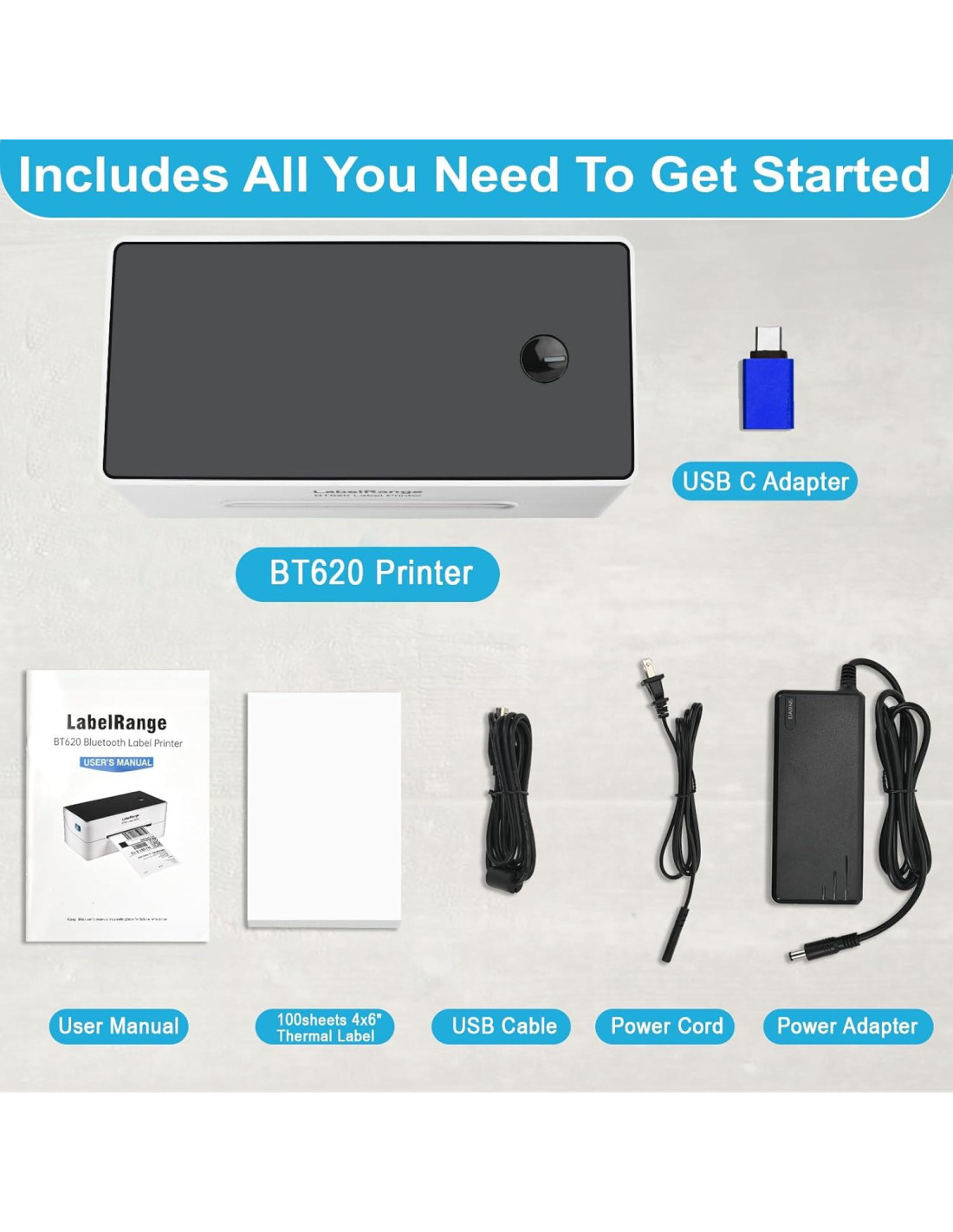 - Componentes incluidos: Impresora de Etiquetas Bluetooth LabelRange BT620, adaptador de corriente/cable de alimentación/cable USB, 100 hojas de etiquetas de 4x6'', adaptador USB-C (para computadoras sin puerto USB), manual de usuario