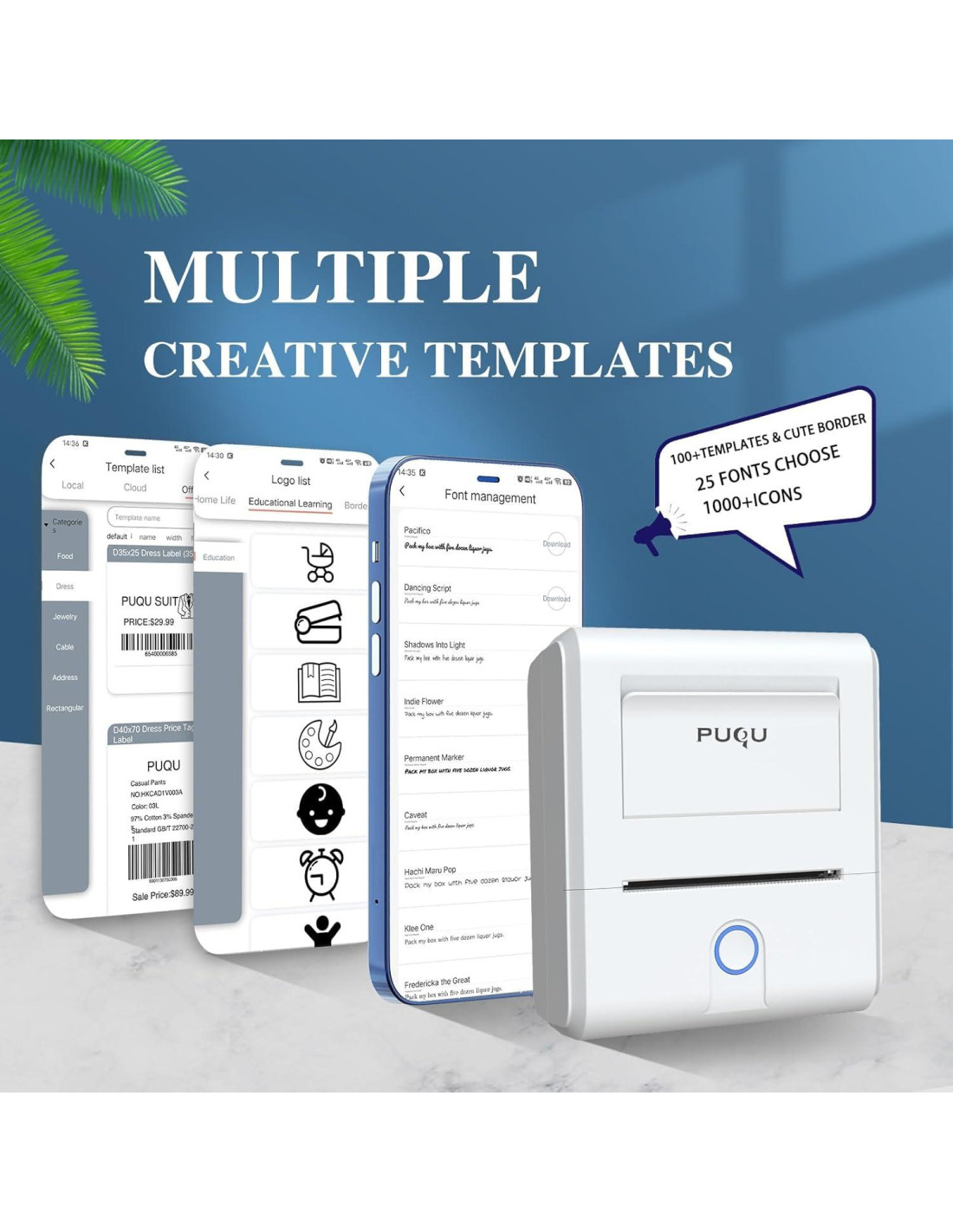 - Máquina de impresión de etiquetas más inteligente - Impresión inalámbrica y conveniente con conexión Bluetooth a través de la aplicación gratuita (PUQU) (soporta Android/IOS). Las impresoras de etiquetas de productos están equipadas con soportes de papel ajustables e identificación automática de etiquetas. Tiene un contenedor de etiquetas más grande y ya no utiliza el soporte de papel tradicional que es propenso a atascos de papel, haciendo su impresión más rápida. (Consejo: Para su mejor experiencia, asegúrese de ver la Guía del Usuario del software en la página)