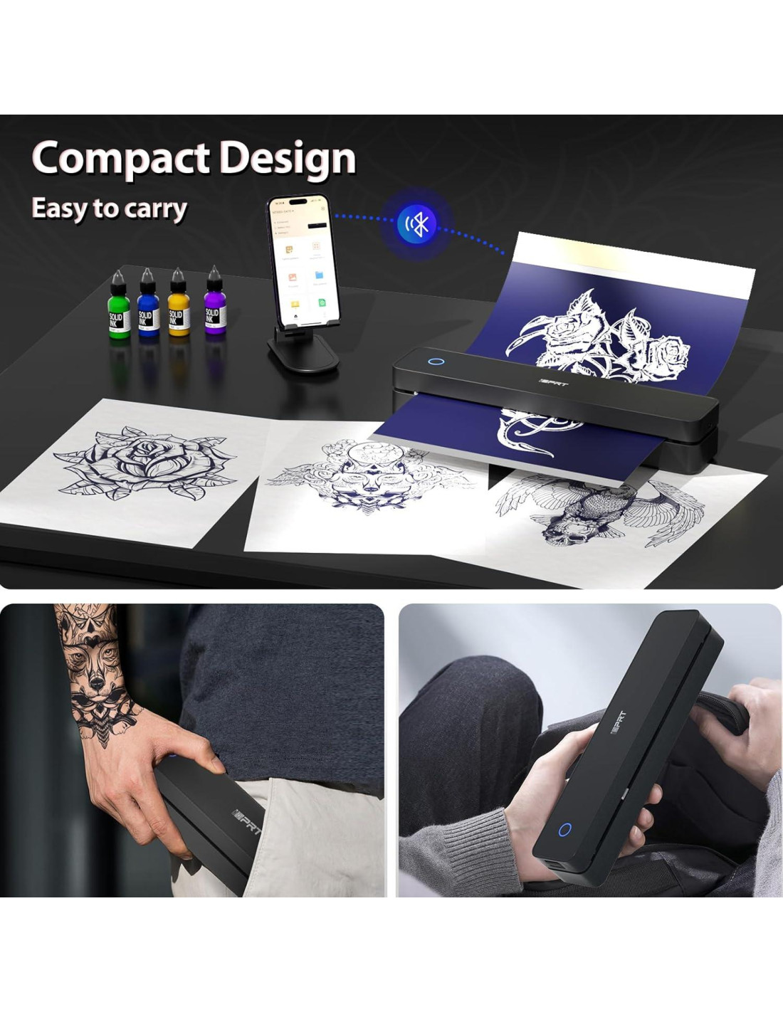 - Impresora de Plantillas de Tatuaje Portátil: Esta impresora de tatuajes es ultraligera, pesando solo 1.1 libras (0.5 kg), es tan pequeña como una botella de agua. Diseño sin tinta e inalámbrico para fácil portabilidad a estudios, hogares de clientes o viajes. También funciona como impresora térmica de documentos (4-8.5 pulgadas (10.16-21.59 cm) de ancho) para impresiones en blanco y negro