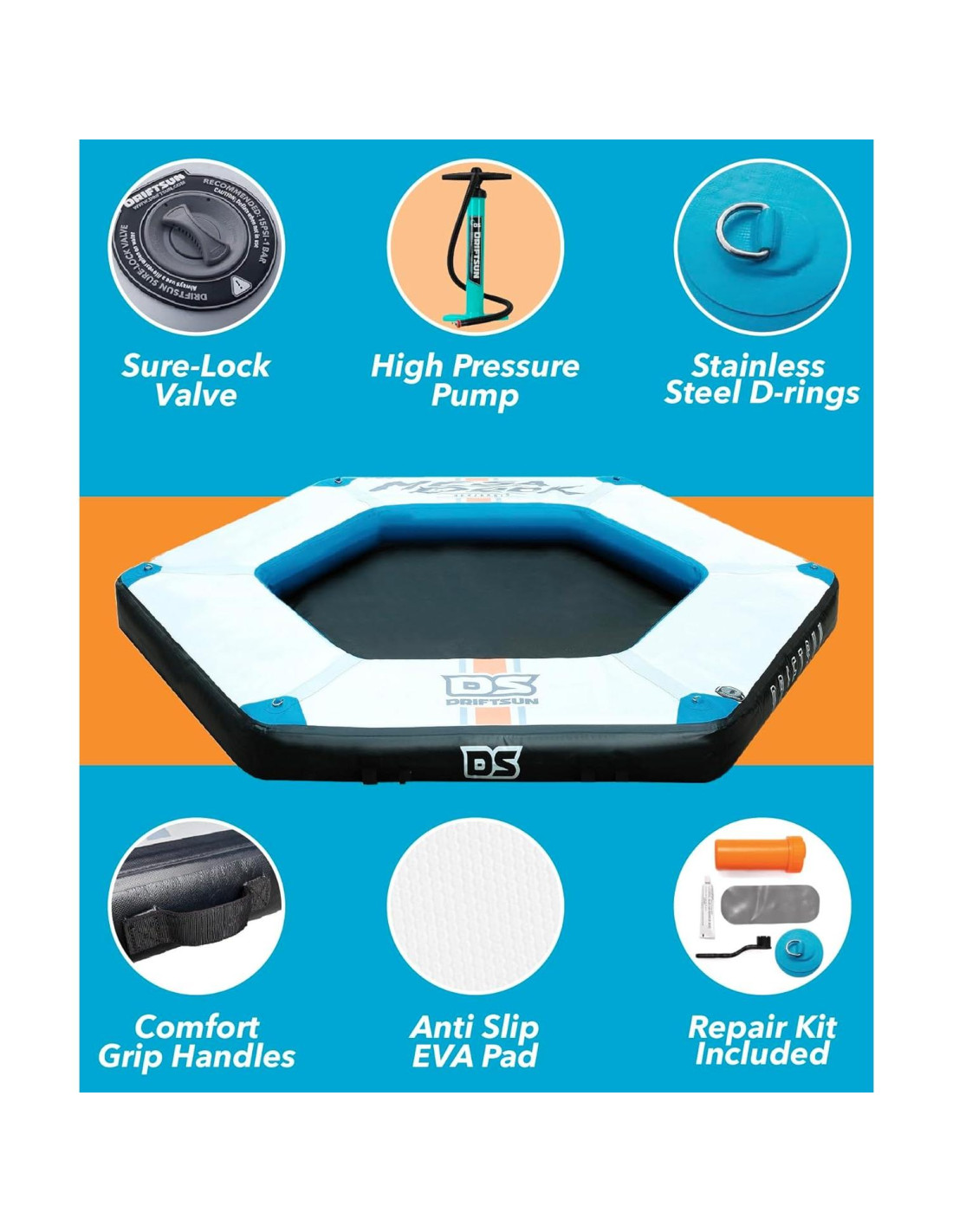 - PERFECTA PARA LA VIDA EN EL LAGO: La plataforma inflable Driftsun, con su forma octagonal única, está diseñada para hacerlo todo. Ya sea anclada en su lugar para trabajos en barco, utilizada como un enorme paddleboard, o configurada con sillas de descanso y una hielera para ver la puesta de sol en el agua, es perfecta para cada actividad en el lago.