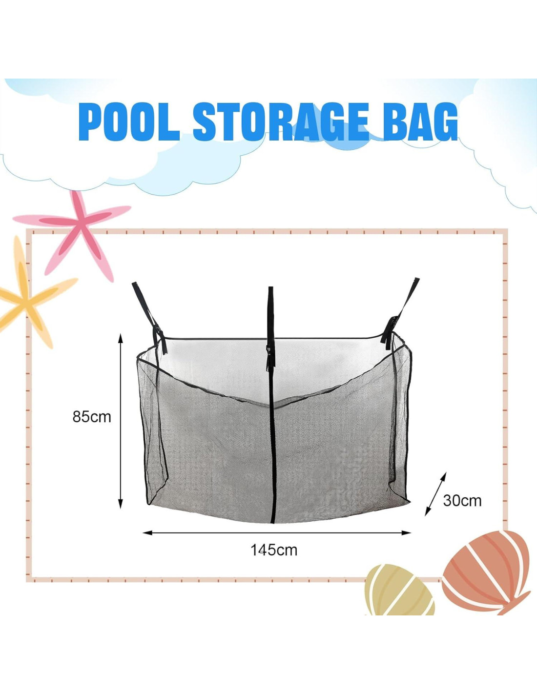 - Fácil de Instalar y Almacenar: Las correas reforzadas y las costuras de malla hacen que la Bolsa de Piscina sea duradera, la bolsa de almacenamiento de malla colgante está diseñada con correas de hombro ajustables y se puede sujetar fácilmente a cercas, bordes de piscina sobre el suelo o de pie. Cuando no esté en uso, simplemente quítela y dóblela.