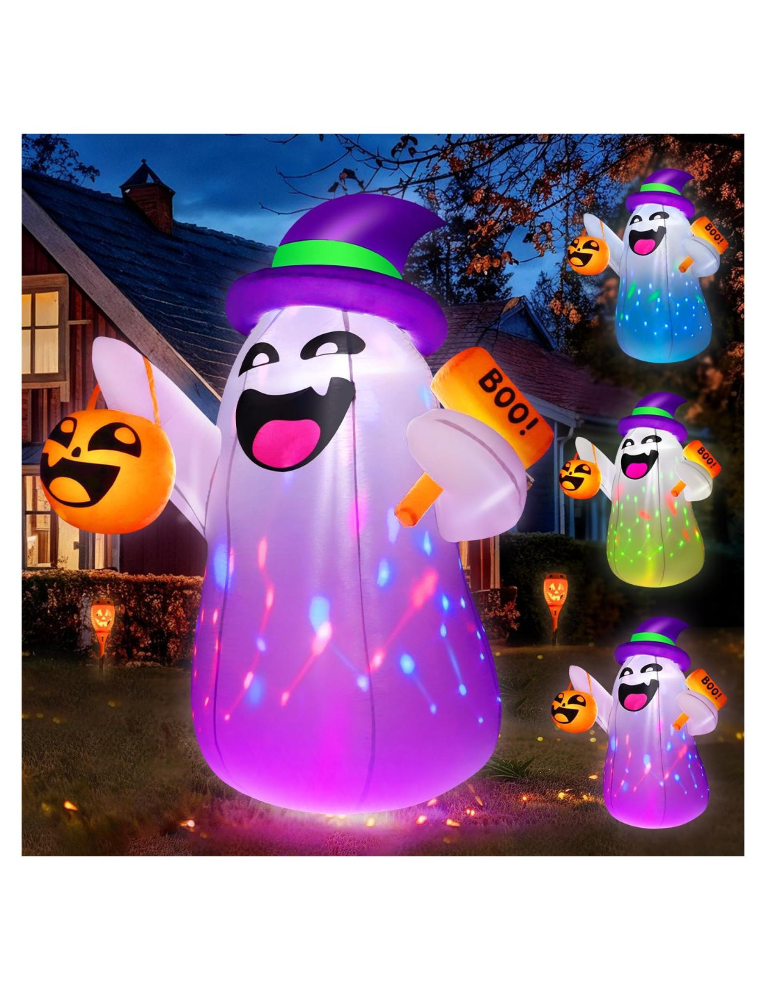 - Fantasma Inflable de Halloween de 5FT con Luz LED Intermitente Multicolor: zukakii diseñó este fantasma inflable con una expresión alegre y risueña, usando un sombrero de mago, sosteniendo un martillo "Boo!" y una cesta de calabaza brillante! Los LEDs brillantes integrados cambian de color 3 veces por segundo, creando un brillo mágico y alegre que deleita a los niños sin asustarlos. Perfecto para atraer a los que piden dulces y agregar diversión a Halloween