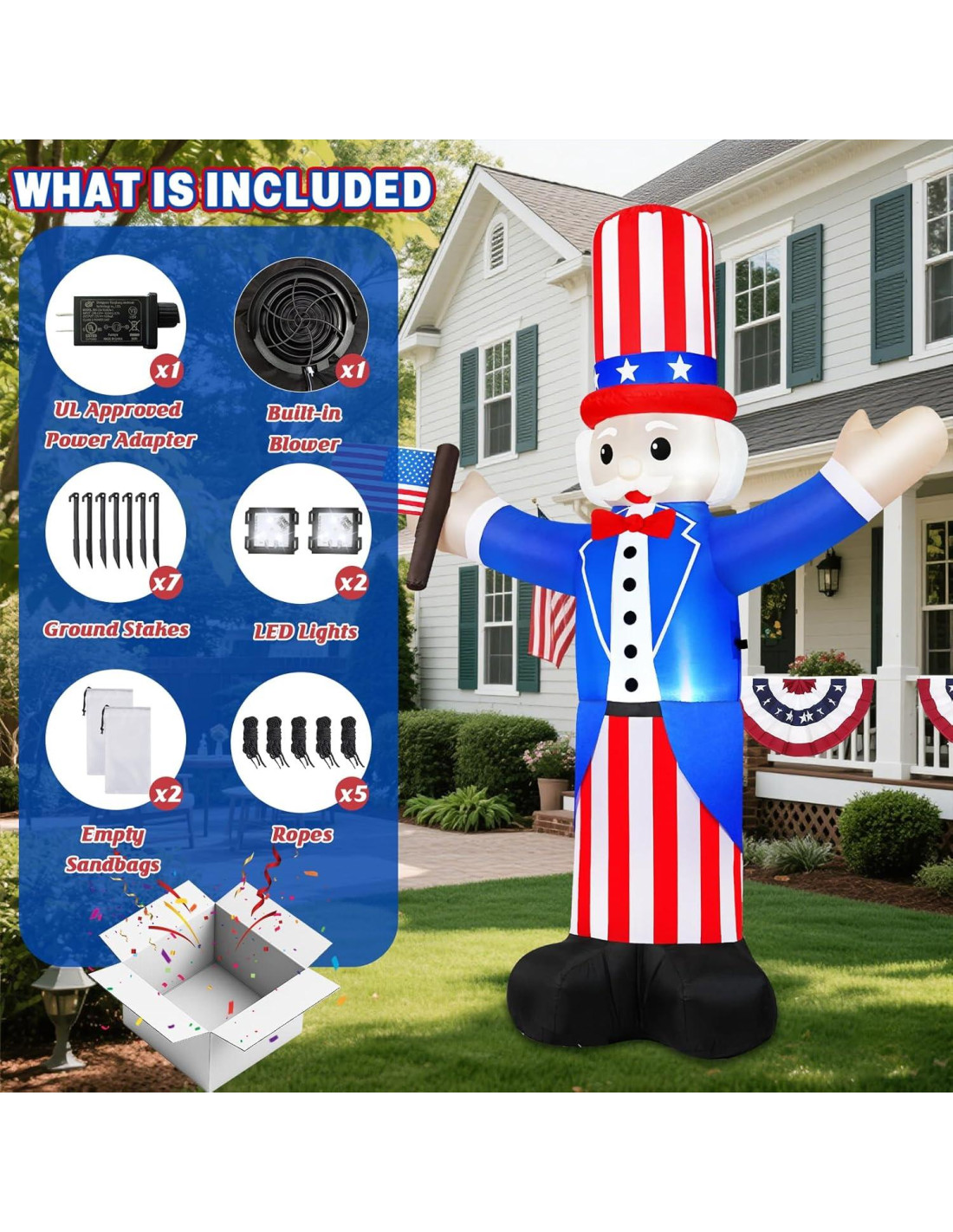 - Decoraciones ideales para el 4 de julio: Muestra tu orgullo patriótico con nuestros inflables del 4 de julio, ¡las decoraciones perfectas para tu jardín! Este inflable alegre de 6FT del tío Sam sosteniendo la bandera americana da la bienvenida cálidamente a tus invitados a las festividades del 4 de julio. Las decoraciones del Día de la Independencia vienen con luces LED super brillantes integradas para iluminar tu jardín con un resplandor patriótico, perfecto para exhibiciones nocturnas que atraen fácilmente la atención de tus vecinos y niños.
