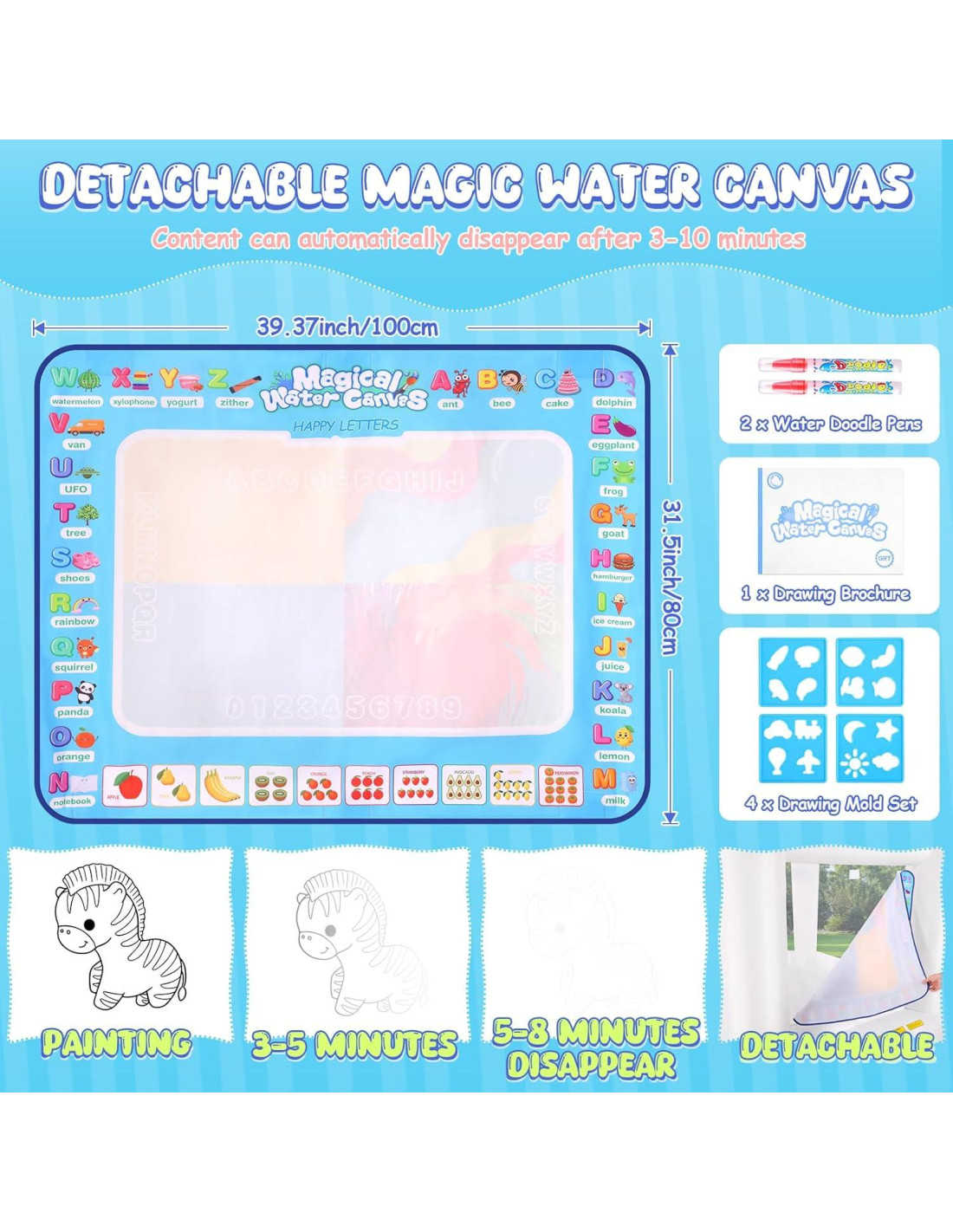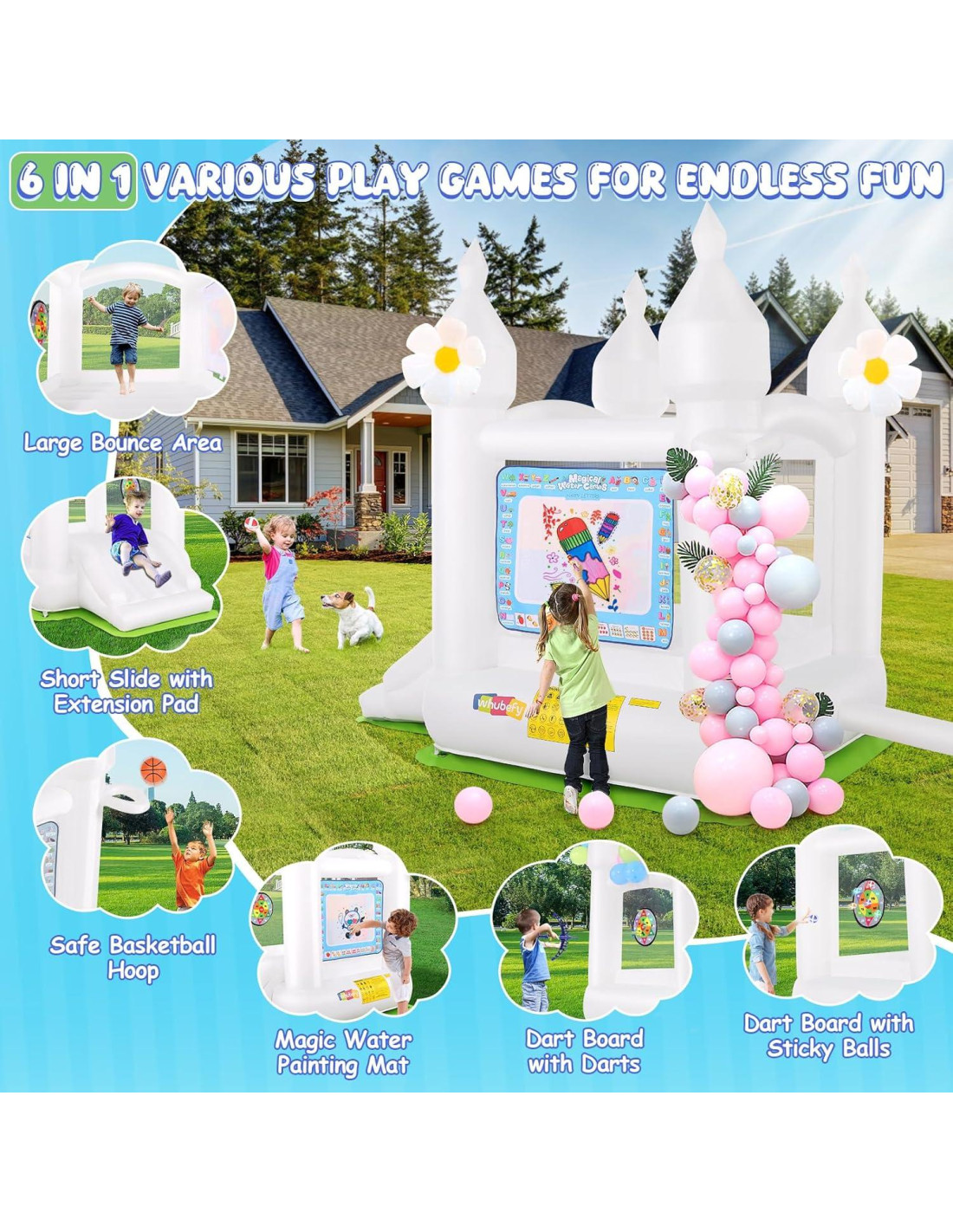 - [Áreas de Juego Atractivas 6-en-1 con Lienzo de Agua Mágico Desmontable] - Nuestro castillo inflable para niños tiene una gran área de salto para jugar, también incluye un aro de baloncesto incorporado (1 Balón de Baloncesto Inflable Incluido), un tobogán suave con almohadilla de extensión, tablero de dardos de doble cara (6 pelotas adhesivas y juego de dardos Incluido). Un lienzo de agua desmontable (6 pelotas adhesivas y juego de dardos Incluido) para traer más diversión a sus hijos. Los niños pueden dibujar con agua y ver cómo sus creaciones desaparecen mágicamente en esta increíble alfombra.