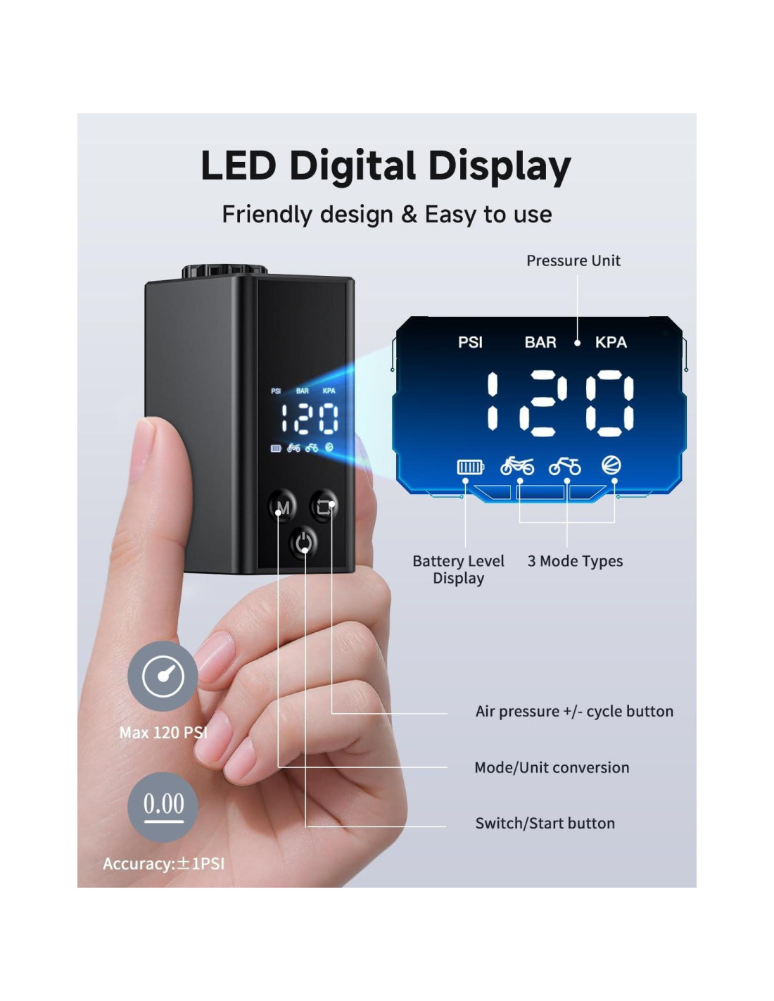 - Apagado Automático, Libera Tus Manos: Modo Libre: Se detiene automáticamente cuando se alcanza la presión establecida; Modo Motocicleta: Se detiene automáticamente a 40 PSI; Modo Bicicleta: Se detiene automáticamente a 36 PSI; Modo Pelota: Se detiene automáticamente a 8 PSI. Función de memoria con configuraciones predeterminadas.