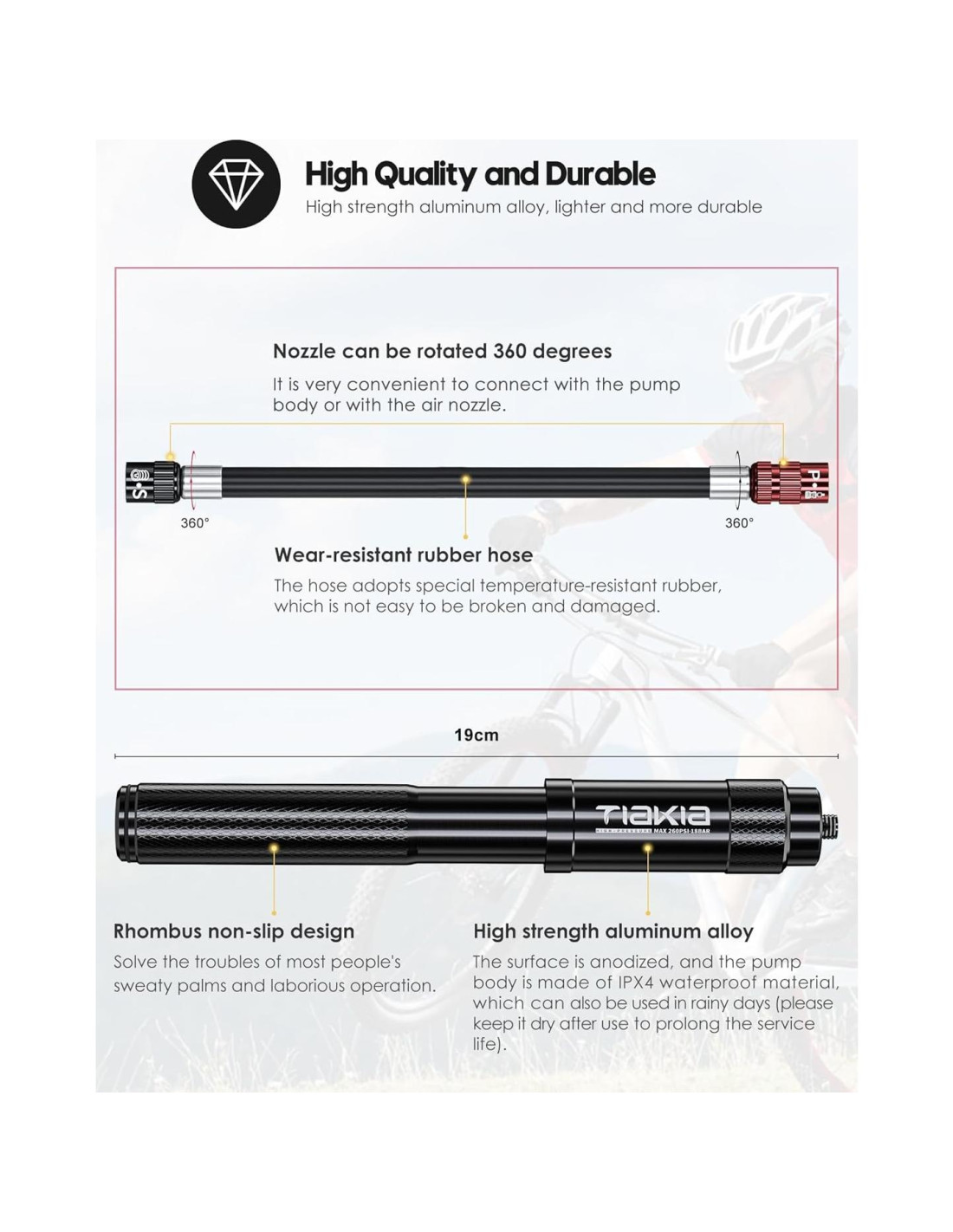 - Más Duradera: El cuerpo de la bomba está hecho de aleación de aluminio, y la superficie está anodizada, lo que tiene alta resistencia a la corrosión y resistencia al desgaste, y es muy duradera. Material impermeable IPX4, se puede usar en días de lluvia (por favor mantén seco después de su uso). La manguera está hecha de goma altamente elástica, que tiene las características de resistencia a explosiones y alta presión.