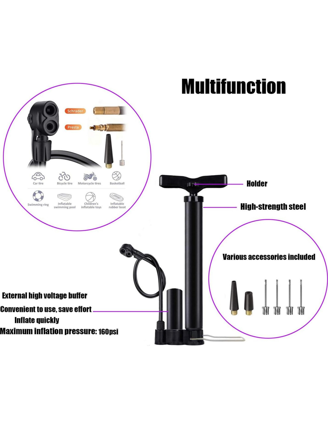 - Válvulas Presta y Schrader: la bomba de neumáticos puede inflar bicicletas, vehículos eléctricos, motocicletas, automóviles, pelotas deportivas y anillos de natación