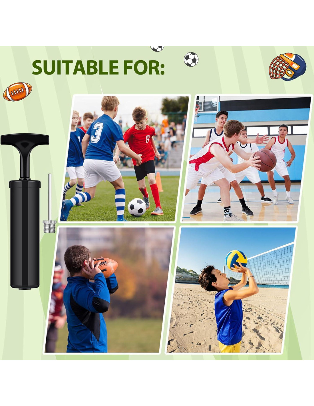 - Bomba de Pelotas de Fútbol Duradera: fabricada con resina de calidad, nuestras bombas de mano para pelotas están construidas para durar; Diseñadas para la resistencia y un rendimiento suave, cada bomba de pelotas para deportes ayuda a mantener los juegos de fútbol, baloncesto y voleibol en marcha sin interrupciones.
