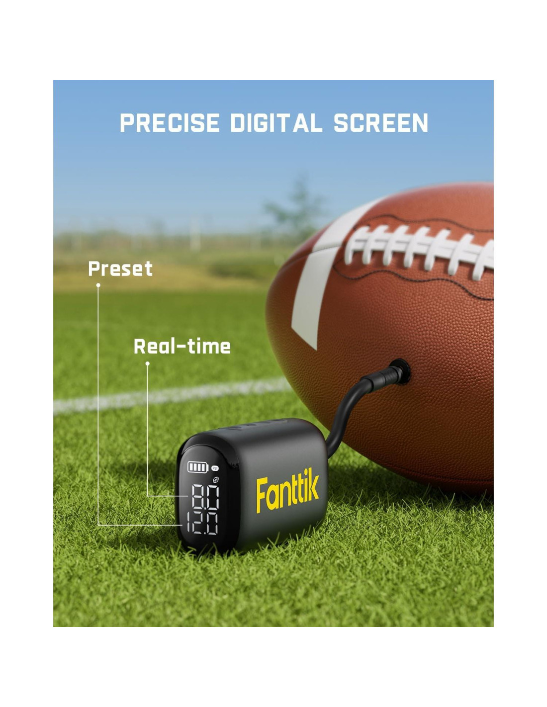 - Preajustes con un clic: Elija entre cuatro modos preestablecidos (baloncesto, fútbol, fútbol americano y voleibol), presione iniciar y deje que la bomba alcance automáticamente la presión preestablecida, asegurando una inflación óptima; No más conjeturas o preocupaciones por sobreinflar - se detiene automáticamente, asegurando la máxima seguridad