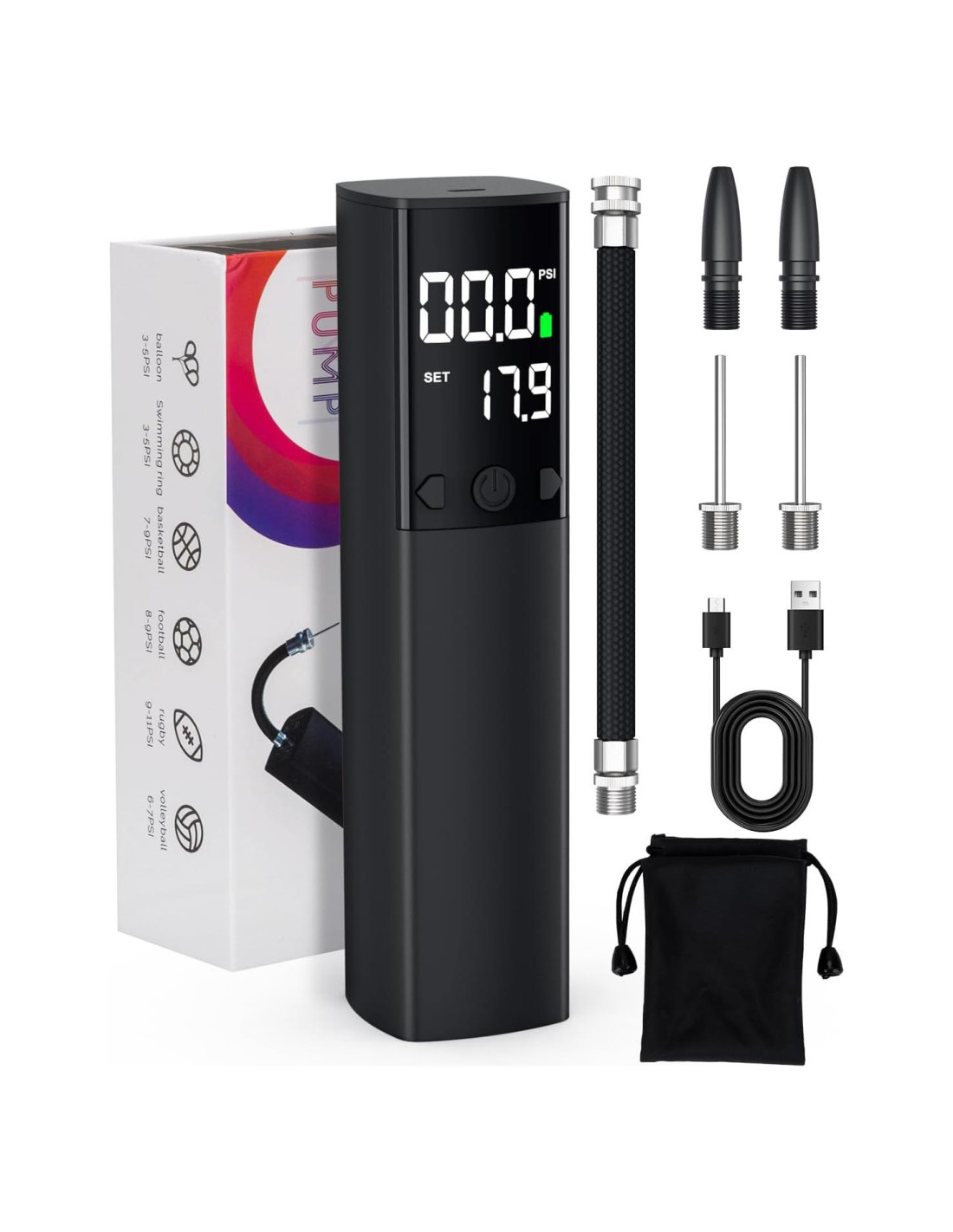 - Diseño Compacto y Portátil: Solo pesa 0.25 kg, y el tamaño es 16 cm x 4 cm x 4 cm, que cabe en tu bolsa e incluso en tu bolsillo. Con la bolsa de mano (incluida), puedes llevarla a cualquier lugar y usarla en cualquier momento. No te preocupes por que tus pelotas se queden sin aire. También cuenta con luces LED integradas y pantalla LCD retroiluminada, para que puedas usar la bomba de pelotas de noche o en lugares oscuros más fácilmente