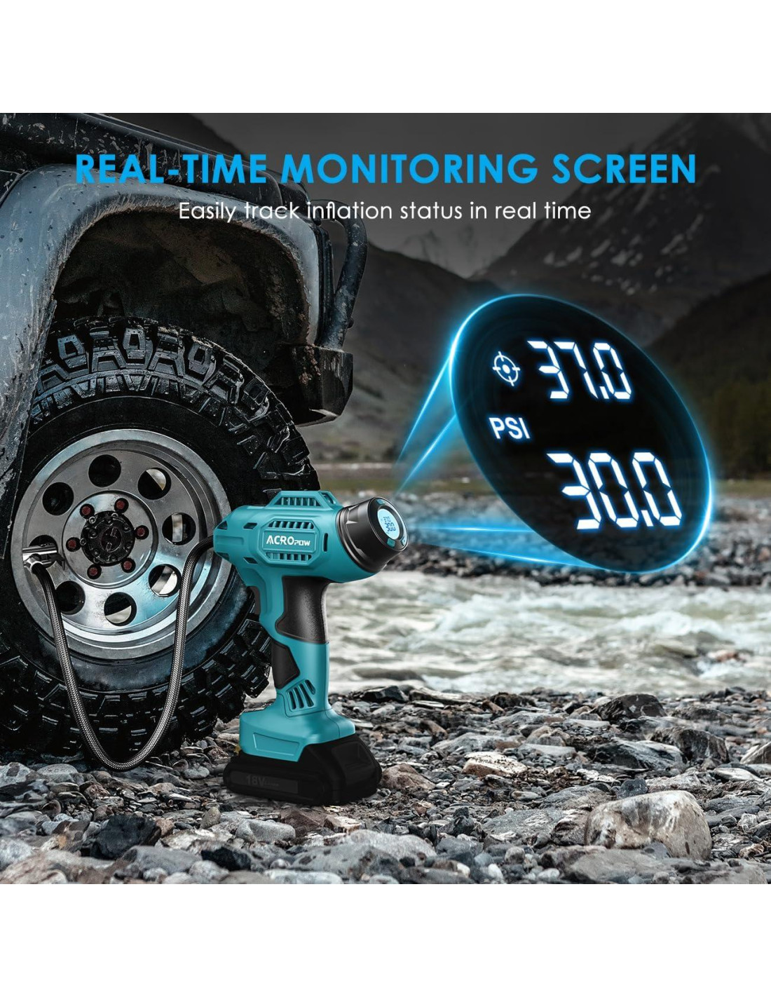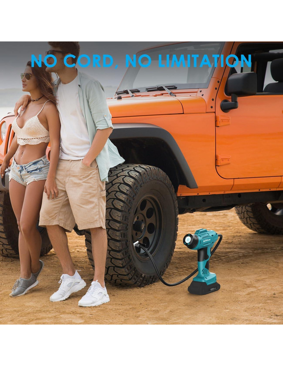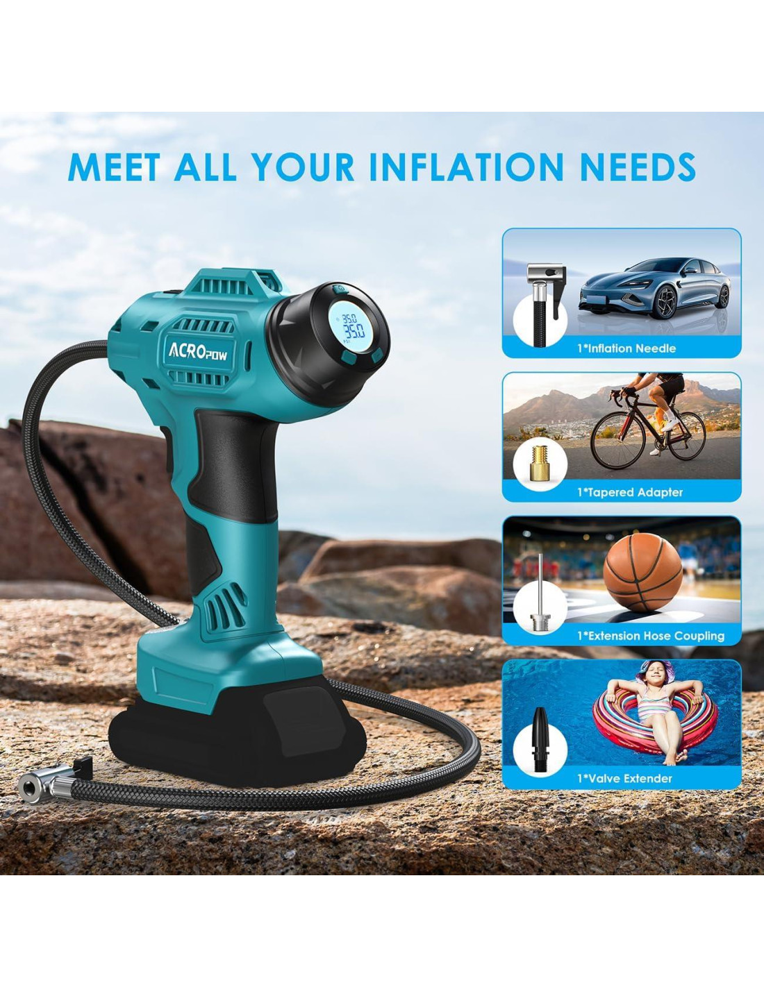 - MÚLTIPLES PROPÓSITOS Y FÁCIL DE USAR Inflador de neumáticos inalámbrico de mano ACROPOW con adaptador de válvula de bicicleta, adaptador de aguja de balón, adaptador cónico es aplicable para automóviles, SUVs, coches, motos, bicicletas y productos inflables del tamaño de un balón de baloncesto. Tendrá control total sobre la presión de sus neumáticos, y el inflador de neumáticos alimentado por batería le ayuda a mantener niveles perfectos para un rendimiento y seguridad óptimos. Nota: no apto para neumáticos de camiones grandes. El inflador funciona con la plataforma de batería Makita de 18 V