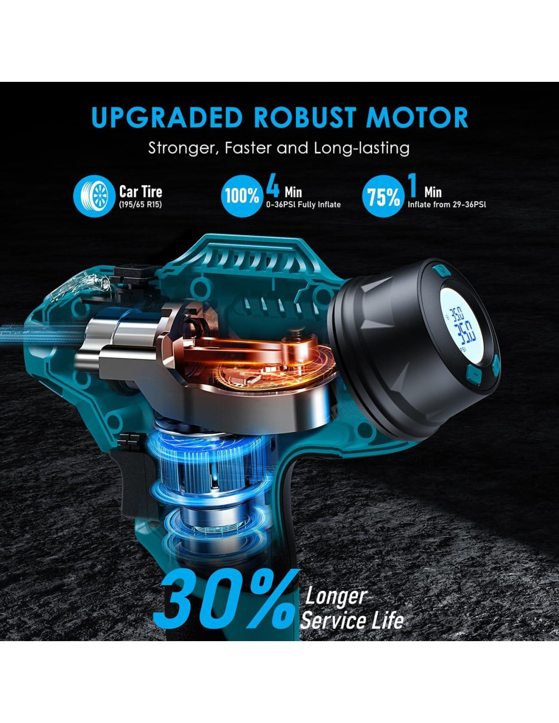 - INFLADOR DE NEUMÁTICOS PODEROSO Inflador de neumáticos inalámbrico ACROPOW de 18 V compuesto por cilindro de metal y engranaje de metal proporciona presión potente y flujo de aire de hasta 25 L/min. Esto significa que puede inflar el neumático sin gas 195/65 R15 en 4 minutos, más conveniente que las bombas de neumáticos eléctricas con cable. La bomba de alta presión proporciona presión potente que permite una amplia variedad de aplicaciones de inflado