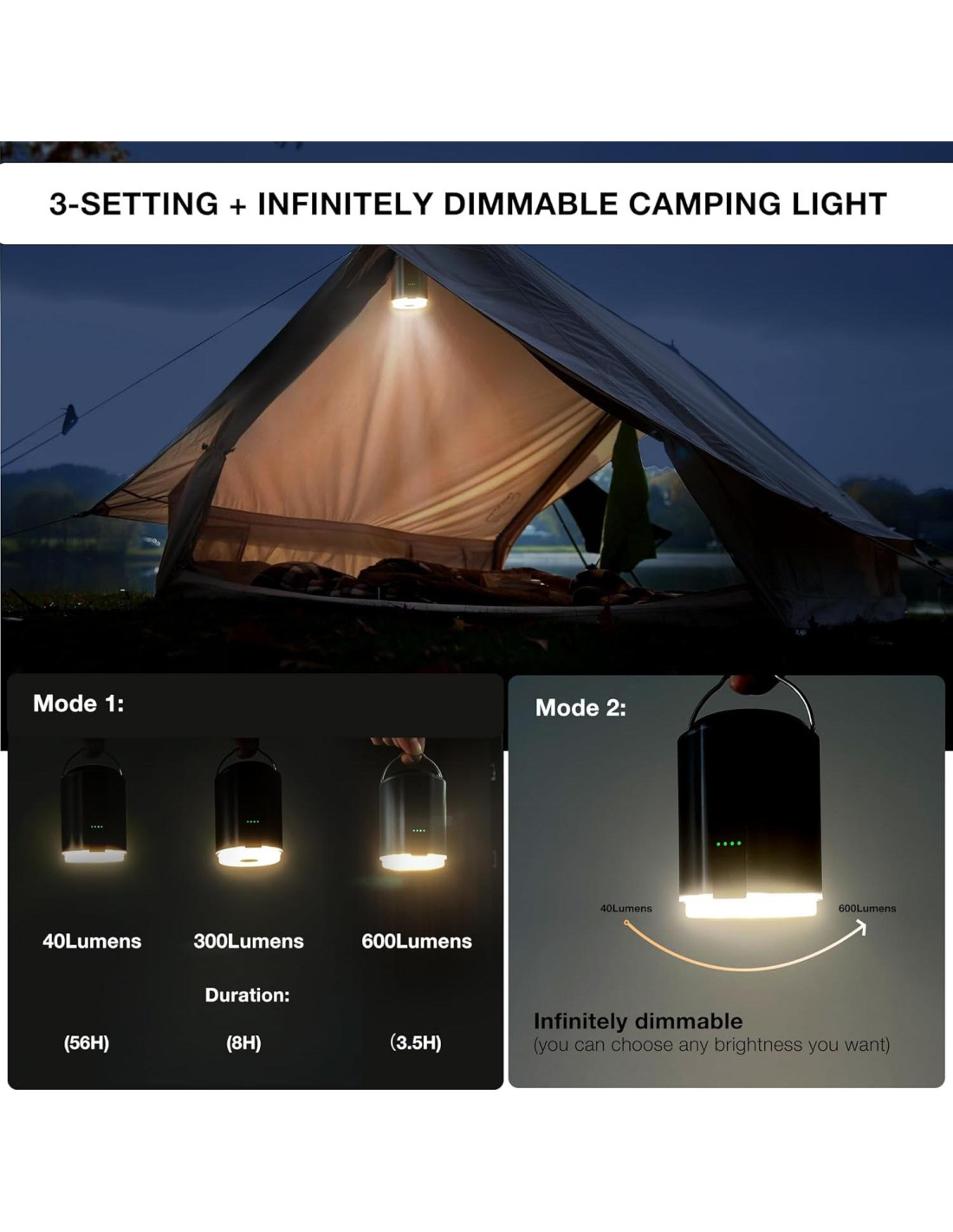 - Luz de Camping de 600lm: La luz de camping integrada de 600lm ofrece ajuste de tres niveles (40lm, 300lm, 600lm) y control de atenuación (40lm-600lm), permitiéndote siempre encontrar el brillo de luz más adecuado para tu entorno. En el modo de iluminación de 600lm, puede operar hasta 3.5 horas, haciéndola altamente adecuada para camping al aire libre y la vida cotidiana. Con un diseño de gancho, se puede colgar fácilmente en una tienda