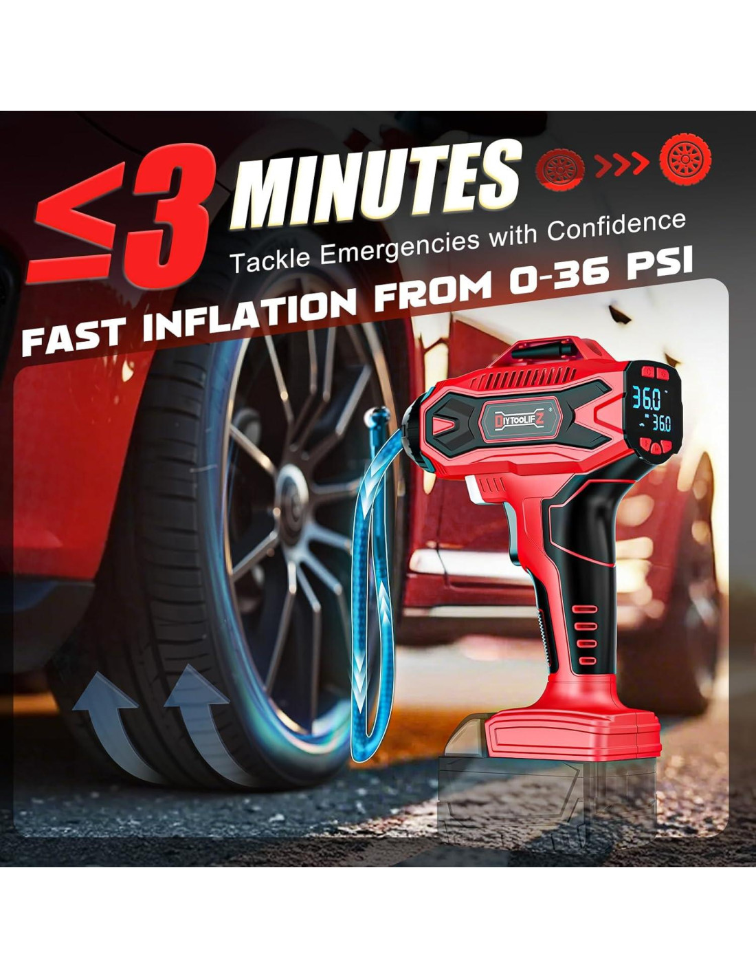 - INFLACIÓN RÁPIDA EN 3 MINUTOS: ¡Experimenta una inflación rápida con nuestro inflador de neumáticos inalámbrico DIYtoolifz! Con una presión máxima de 160 PSI (11.03 bar) y un cilindro de aire de 25 mm que alcanza velocidades de hasta 30L/min, infla completamente un neumático 195/65/R15 en menos de 3 minutos. Perfecto para inflar rápidamente neumáticos de autos, bicicletas, motocicletas, pelotas deportivas, juguetes de piscina y más.