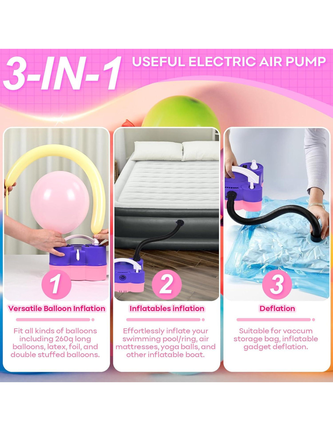 - Jobkoo Bomba de aire eléctrica 3 EN 1: Esta versátil bomba eléctrica de globo para todos los globos es un inflador y deflador para inflables y bolsas de almacenamiento al vacío. Ideal para decoraciones de fiestas, celebraciones y uso en el hogar, esta bomba de aire eléctrica portátil y fácil de usar es un imprescindible para cada hogar