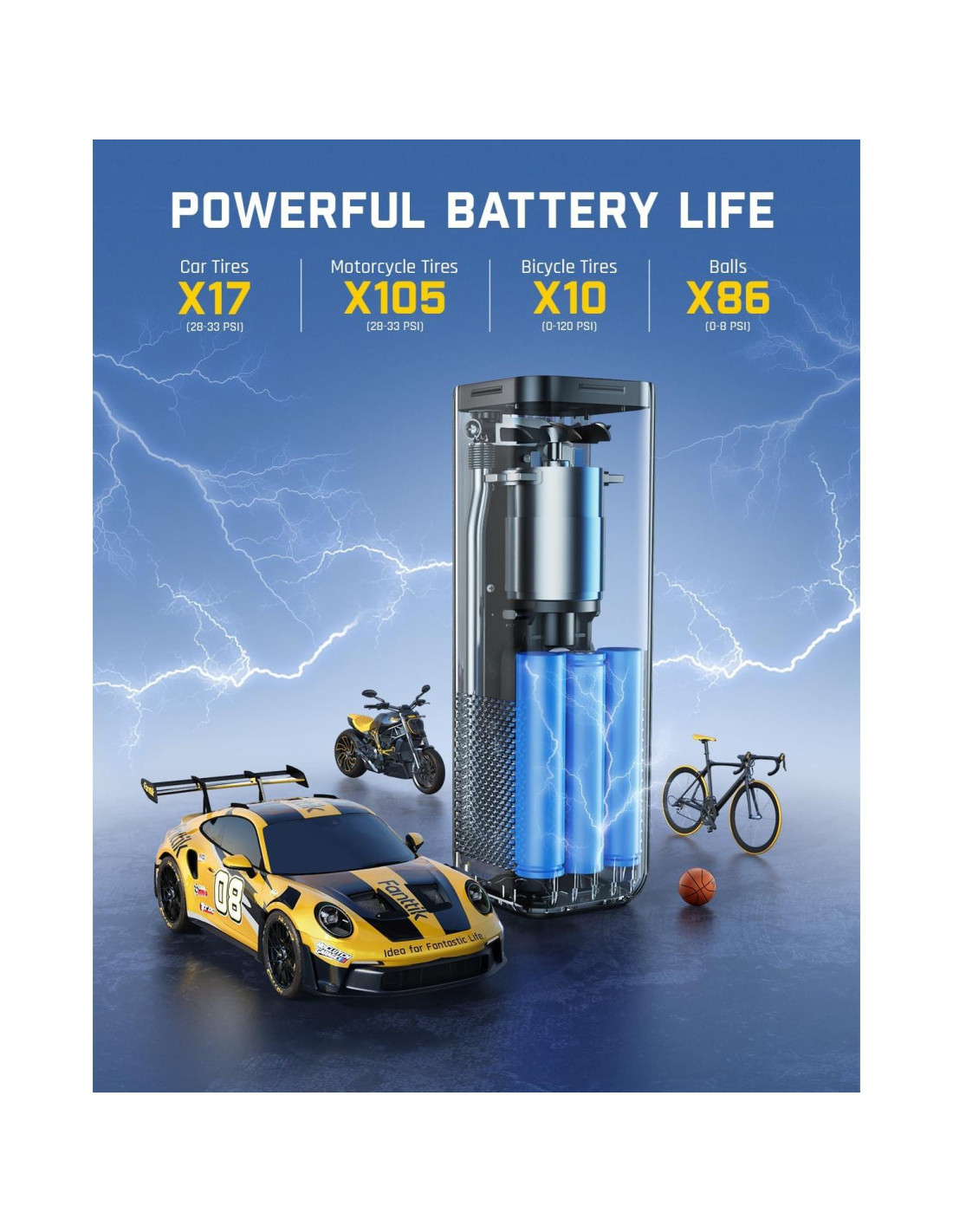 - Duración de batería potente de hasta 40 minutos: Bajo temperaturas exteriores típicas, el X8 Apex puede funcionar continuamente durante 40 minutos con una carga completa. Con nuestra innovadora función de enfriamiento, puede bombear continuamente 16 neumáticos sin pausas. No es necesario esperar a que se enfríe