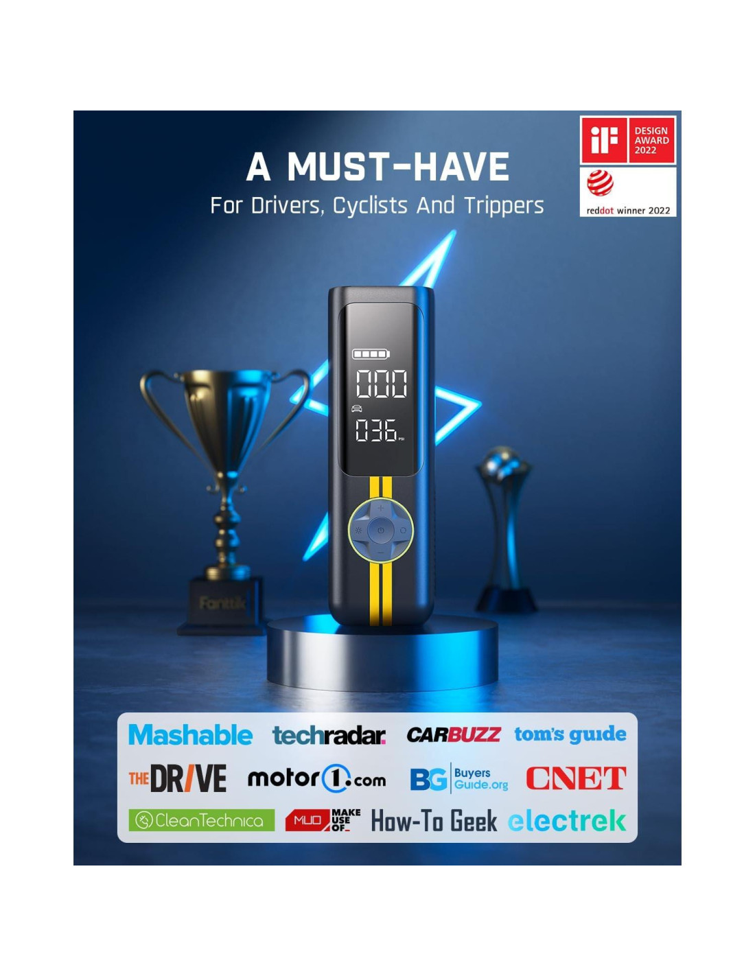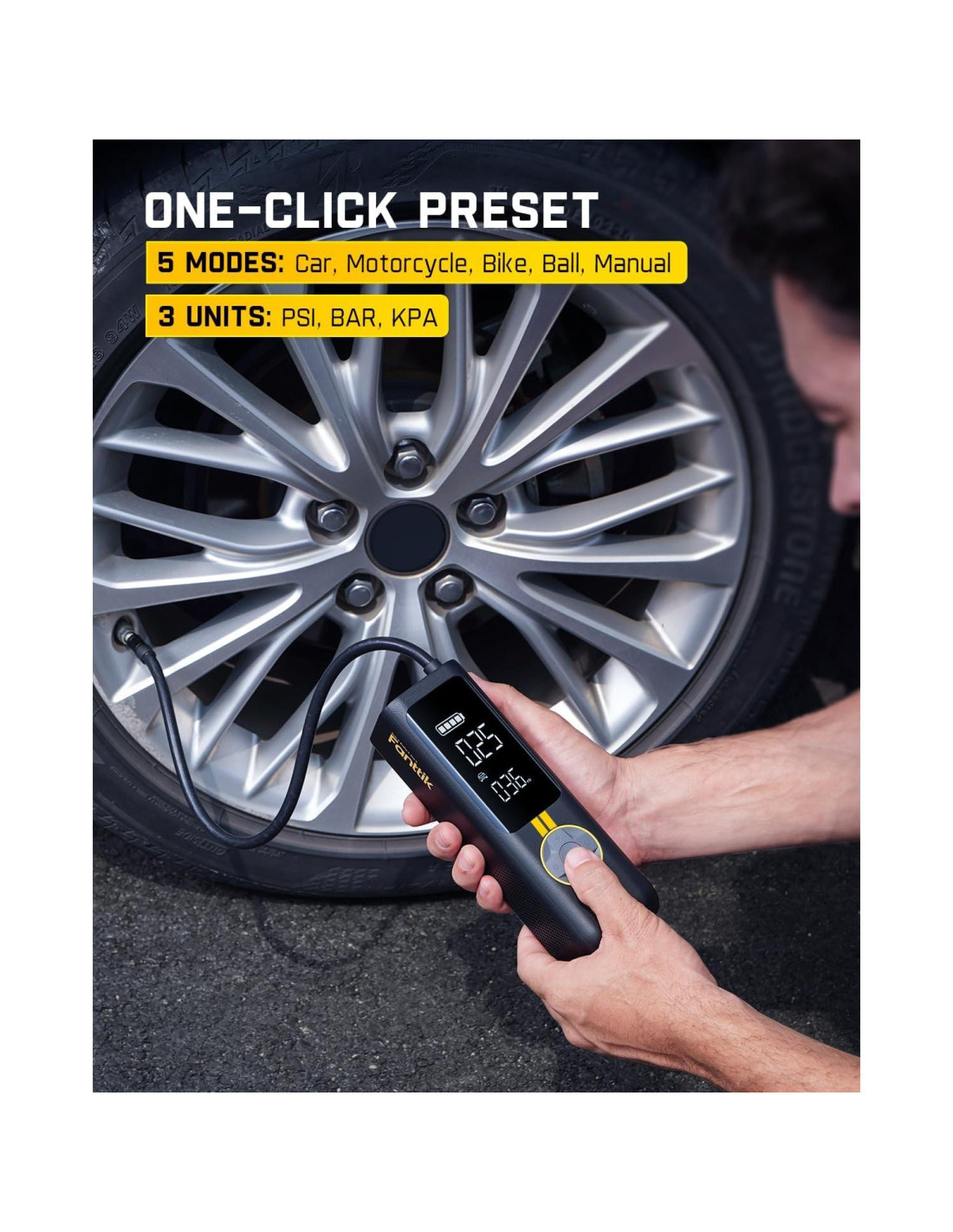 - Inflado rápido: Solo toma 56 segundos inflar un neumático de 66.8 cm de un coche de tamaño mediano (28-33PSI). Infla con una precisión de 1PSI. Siendo más rápido y altamente preciso, es tu elección ideal para un inflador de neumáticos