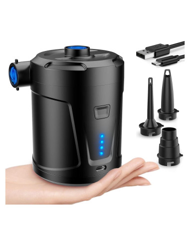 - [Operación con un Botón y Alta Eficiencia en Inflar/Desinflar] Fácil operación con un botón: 1. elige la boquilla adecuada y conéctala al puerto de inflado/desinflado. 2. Mantén el interruptor durante 2 segundos para encender la bomba de aire, y presiona brevemente para apagarla. (Asegúrate de que no haya espacio entre el anillo inferior del accesorio y el borde de la bomba)