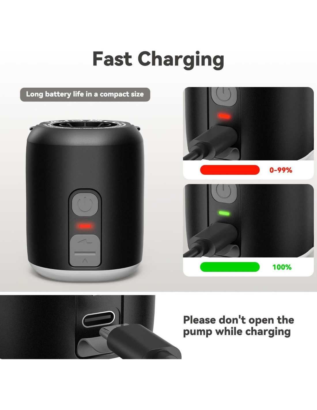 - Batería Recargable de 1600mAh: La bomba de aire eléctrica recargable está equipada con una batería de 1600mAh incorporada y se puede usar sin conectarse a un enchufe o fuente de energía exterior. El conector Type-c admite 4 métodos de carga: energía móvil, computadora portátil, cargador de automóvil o adaptador de corriente. Luces Indicadoras de Carga Convenientes: Verde indica que la carga está completa, Rojo indica estado de 0-99%.