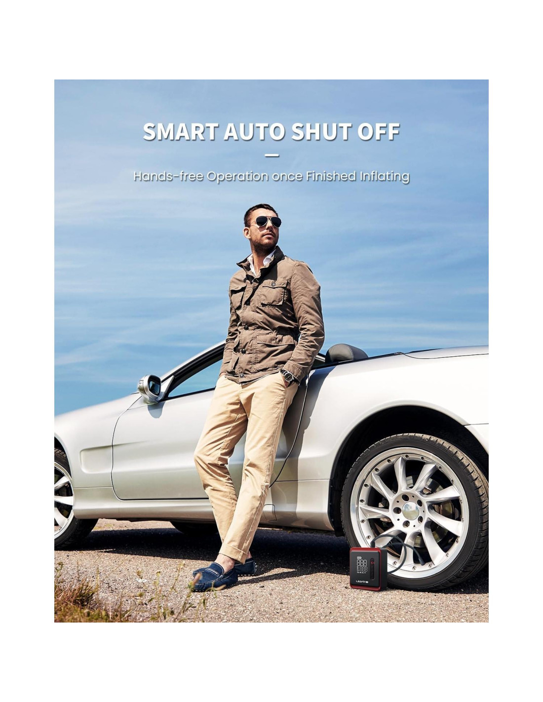 - [La Bomba de Neumáticos Más Fácil e Inteligente] ¡Súper fácil comenzar la inflación con la función de parada automática y preestablecida mejorada! Fácil de elegir modos (coches, bicicletas, pelotas o personalizado), y presiona el botón de encendido para inflar rápidamente tus neumáticos. Esta bomba de aire portátil para neumáticos de automóvil liberará tus manos al inflar neumáticos. Cuando el PSI del neumático se alcance, esta bomba de neumáticos se detendrá automáticamente. Precisión de presión dentro de +/-0.5PSI.