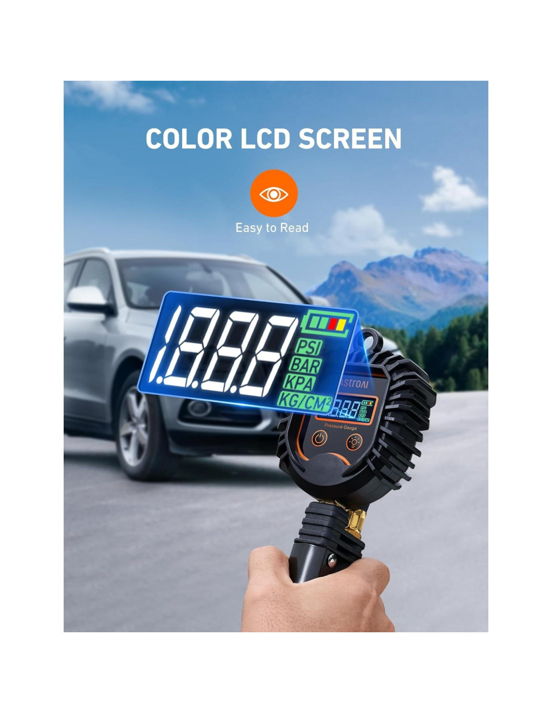 - Lecturas precisas dentro del 1% y resolución de 0.1 PSI (0.007 bar), Muestra unidades kg/cm, kPa, PSI (0.0689 bar) o Bar