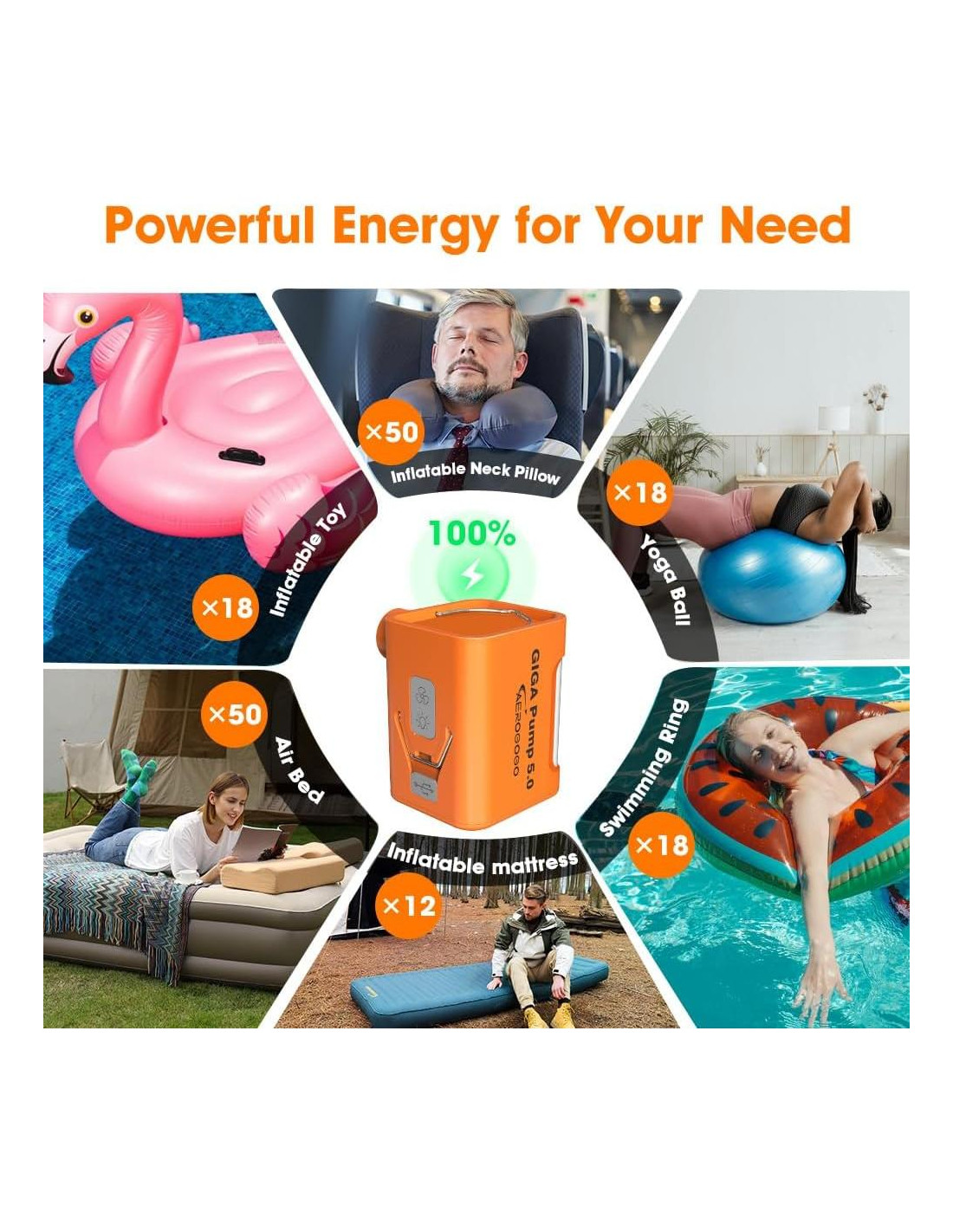 - 5 Boquillas y Uso Versátil - GIGA PUMP 5 viene con cinco accesorios de boquilla versátiles, convirtiéndola en su solución ideal para inflar todo, desde colchones de aire para camping hasta almohadas inflables en forma de cuña, almohadas de elevación de piernas y flotadores de piscina juguetones. También es increíblemente efectiva para sellar al vacío bolsas de almacenamiento, asegurando que su equipo esté compacto y protegido. Eleve sus experiencias al aire libre y de almacenamiento con la multifuncional GIGA PUMP 5.0.