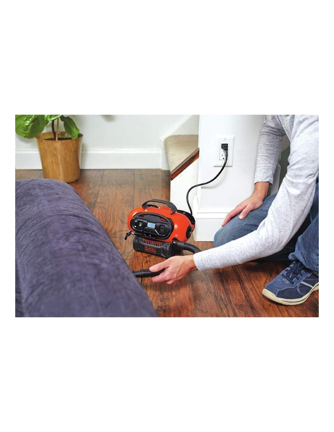 BLACK+DECKER BDINF20C Inflador Inalámbrico de Litio de 20V Multiusos (Solo Herramienta) puede manejar necesidades de inflado en cualquier lugar. Las tres fuentes de energía permiten inflar dentro del hogar, en la carretera o en el patio trasero (12V CC, 120V CA, batería de 20V máx). Su salida de alto volumen llena rápidamente inflables más grandes como balsas y colchones de aire. Además, la función de desinflado vacía rápidamente el aire para una limpieza rápida. La salida de alta presión infla neumáticos y pelotas deportivas. Completo con un manómetro digital y tecnología de apagado automático, este inflador brinda tranquilidad de configurar y olvidar. Respaldado por la garantía limitada de 2 años de black+decker. Incluye: (1) Inflador Bdinf20, (1) Aguja para pelotas, (1) Adaptador de válvula Presta, (1) Adaptador inflable pequeño, (1) Manguera de gran volumen. Batería vendida por separado.