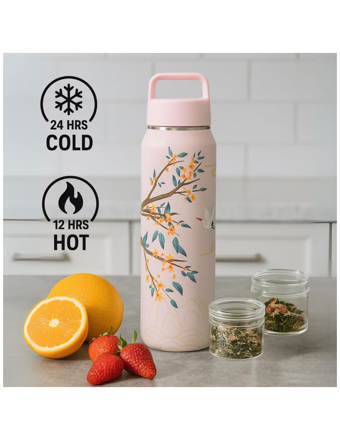 - ARTESANÍA PREMIUM - Este vaso sirve tanto como botella de agua como botella infusora de frutas, café y té. Fabricado con acero inoxidable de primera calidad, aislamiento de doble pared y una base antideslizante, es la botella definitiva para bebidas calientes y frías con un infusor incorporado para té de hoja suelta.