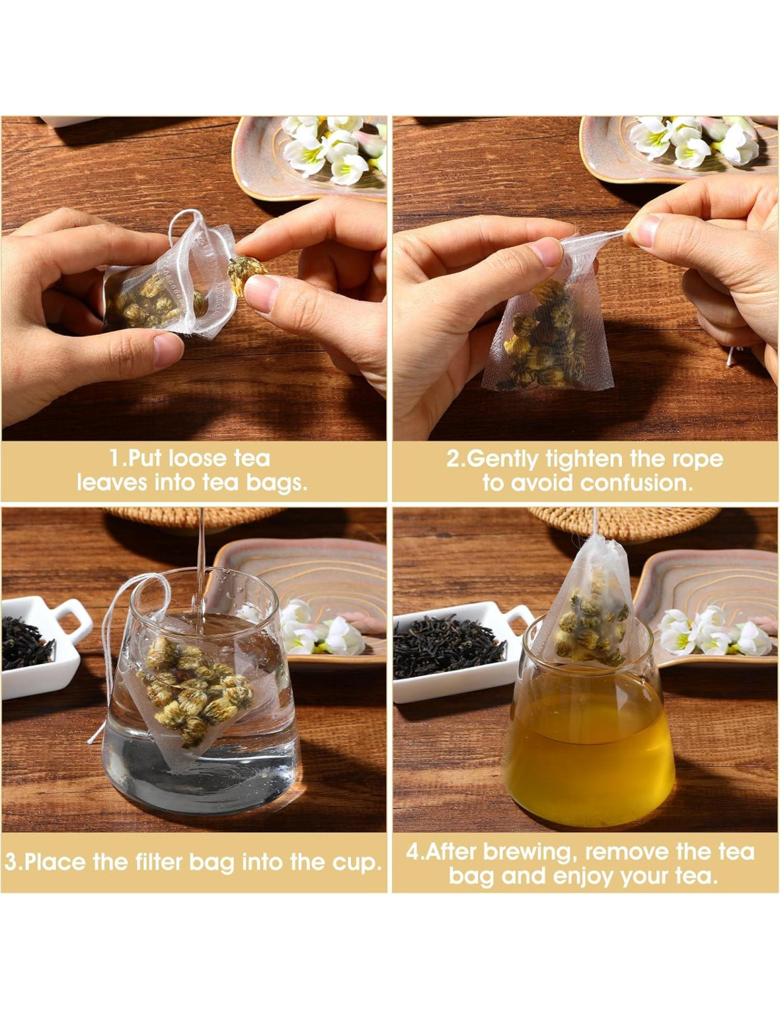 - Diseño Conveniente: Estas bolsitas de té cuentan con un cierre de cordón, lo que las hace fáciles de usar y desechar. Ideal para té suelto, las bolsitas de té de nylon ofrecen una experiencia de preparación sin complicaciones