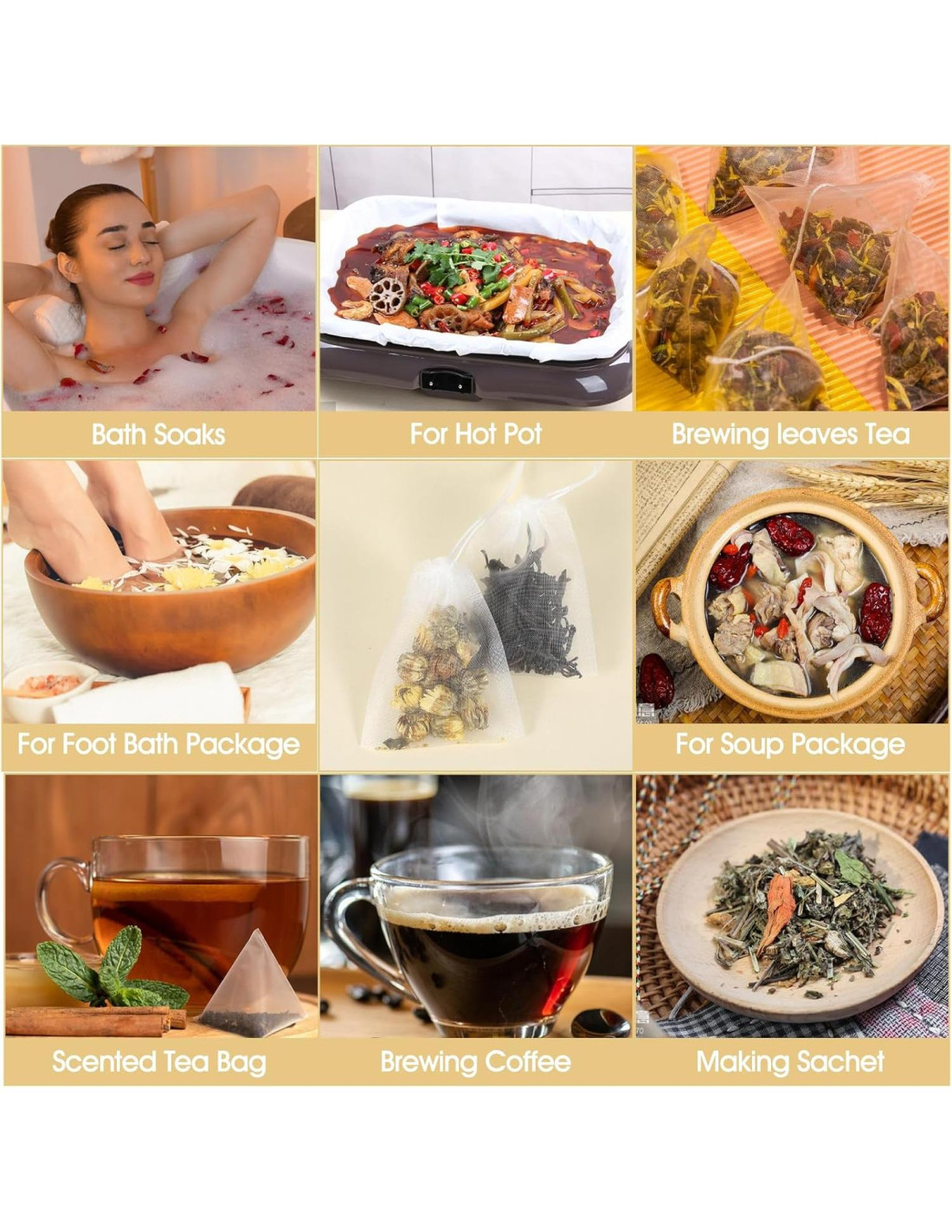 - Material de Alta Calidad: Nuestras bolsitas de té para té suelto están hechas de nylon duradero, asegurando permeabilidad y resistencia al calor. Perfecto para preparar té suelto y bolsas de especias vacías para cocinar