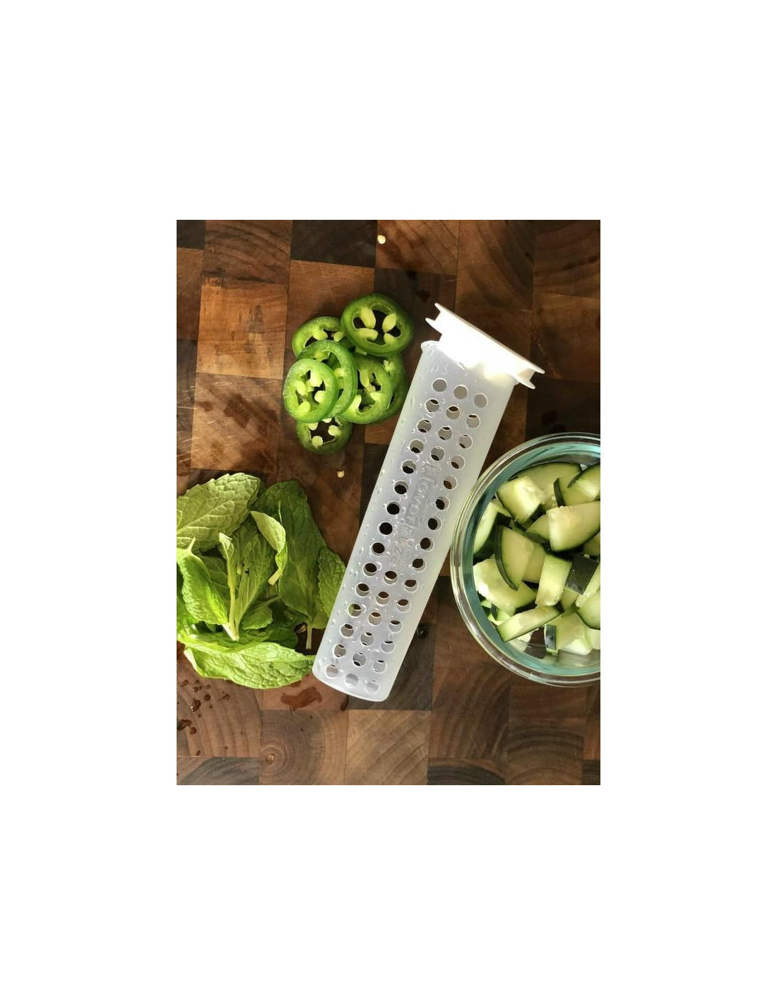 - El tubo mide 6 pulgadas (15.24 cm) de alto y es más grande que otros infusores del mercado secundario, por lo que puedes colocar mucha fruta para un sabor extra.