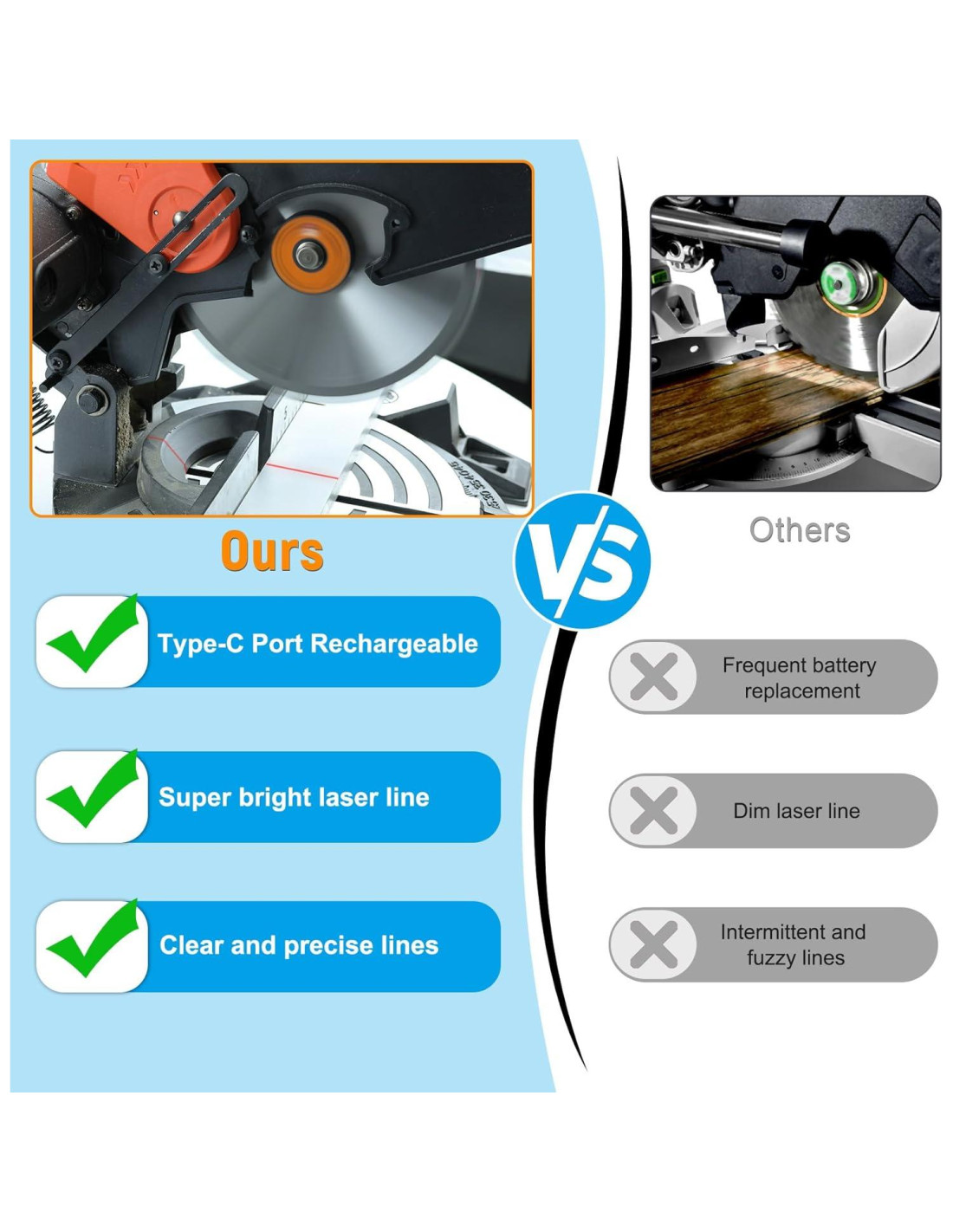 - Diseño recargable: el accesorio de guía láser para sierra ingletadora está equipado con una interfaz de carga rápida tipo C, que se puede cargar completamente en aproximadamente 15 minutos, sin los tediosos pasos de reemplazo de batería.
