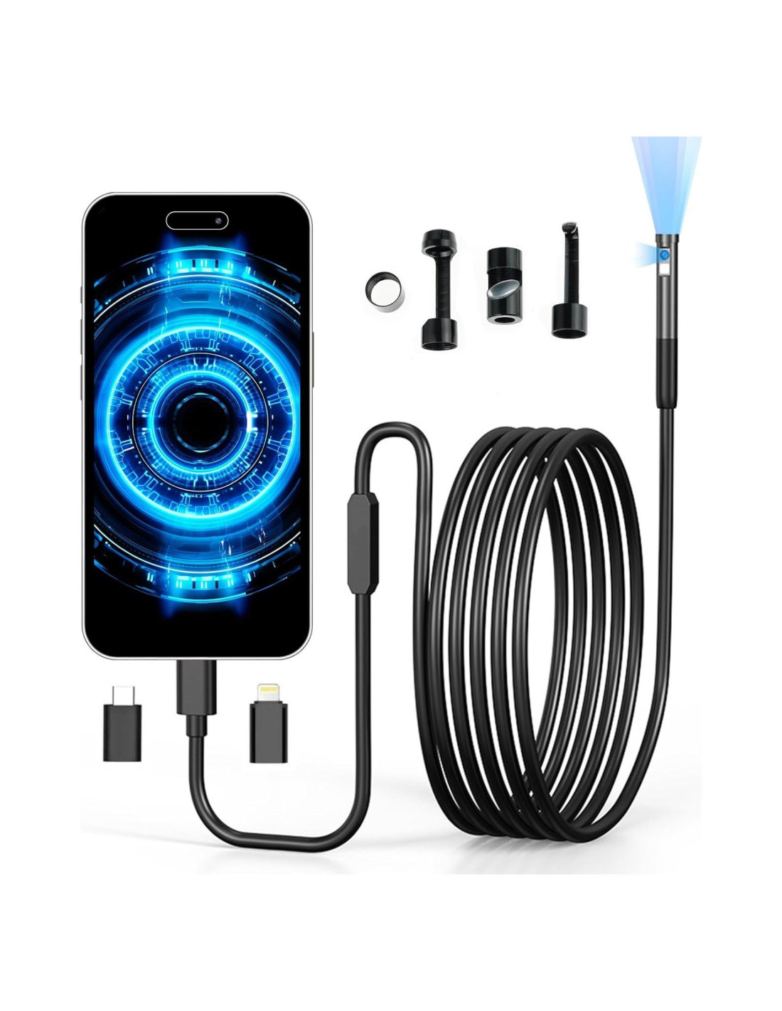 La cámara de inspección por endoscopio adopta un diseño de doble lente HD 1920*1440, observación en múltiples ángulos, mejora la eficiencia y precisión de la detección. Equipado con interfaces de tres modelos: Type-C, Micro-USB, Lighting, puede conectarse fácilmente a sistemas (Android 4.4+, iOS 9.0+ y superiores). Utilizando un núcleo de cable superconductores de cobre puro, la transmisión de calidad de imagen es más estable. Cable grueso, resistencia al desgaste, prolonga la vida útil, despídete de los tartamudeos. 8+1 Luz LED Ajustable: Con ocho LEDs para la cámara frontal y uno para la cámara de vista lateral, estos LEDs de alta intensidad se pueden ajustar según tus necesidades, asegurando una excelente visibilidad en cualquier situación. IP67 a Prueba de Agua: Sellado con un pegamento especial, resistente a la corrosión y al desgaste, la cámara de inspección por endoscopio puede enfrentar fácilmente el duro entorno submarino. Ampliamente Utilizado: Adecuado para inspección de tuberías industriales, aeroespacial, reparación automotriz, inspección de edificios, revisión de paredes, mantenimiento de HVAC, limpieza de conductos de secadoras, exploración al aire libre, observación submarina, reparación del hogar, medición de tuberías y otras áreas de difícil acceso.