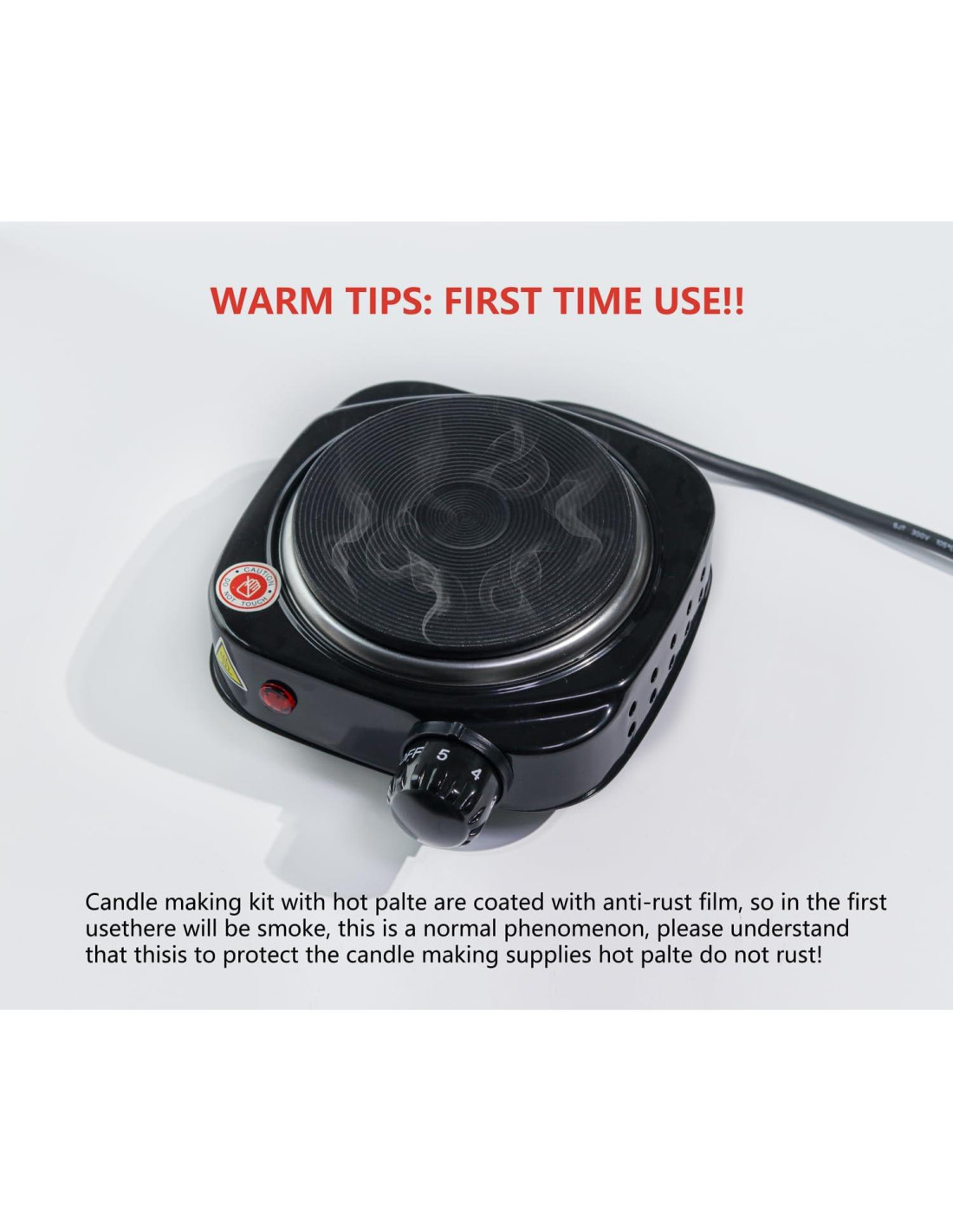 - Suministros para hacer velas - El kit de inicio para hacer velas incluye 1x olla para derretir cera de 40oz (1200ml), 1x placa caliente de 500w, 20x mechas para hacer velas, 20x pegatinas para mechas, 1x cuchara para revolver, 1x termómetro, 1x alfombrilla resistente al calor, dispositivo de centrado de mechas, 1x manual del usuario.