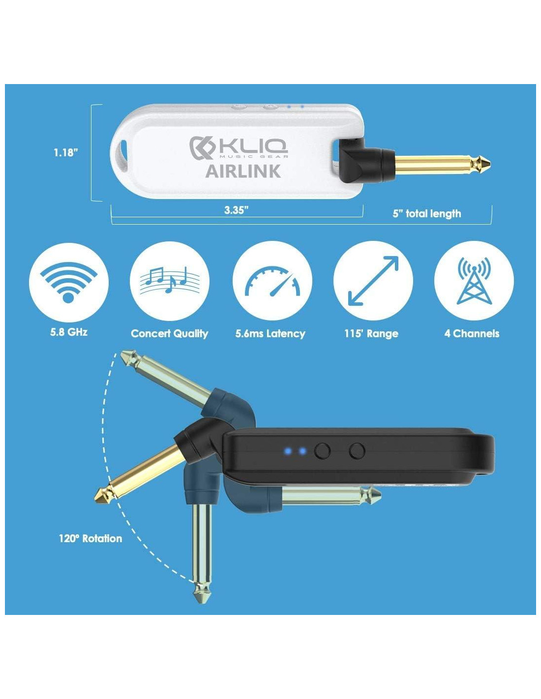 Corta los cables y toca libremente con el Sistema Inalámbrico de Guitarra KLIQ Airlink de 5.8 GHz; diseñado para guitarras eléctricas, bajos y otros instrumentos con un conector de salida de 1/4" (6.35 mm). Este compacto conjunto de transmisor y receptor inalámbrico ofrece sonido de calidad profesional con calidad de audio de 24-bit/48kHz, latencia ultra baja de menos de 5.6 ms, y un amplio rango dinámico para una verdadera integridad de señal. Operando en la banda de 5.8 GHz menos congestionada, el Airlink minimiza la interferencia y soporta hasta cuatro sistemas simultáneamente, lo que lo hace ideal para bandas y configuraciones en el escenario. Con un rango de transmisión de hasta 35 metros (115 pies), puedes ensayar, actuar o grabar con total libertad, sin cables, sin restricciones. La batería recargable incorporada ofrece hasta 4 horas de tiempo de reproducción y se recarga completamente en solo 1.5 horas. Incluye un cable de carga USB dual, que te permite cargar tanto el transmisor como el receptor al mismo tiempo con facilidad. Diseñado para versatilidad, el conector rotatorio de 1/4" (6.35 mm) se adapta a la mayoría de los instrumentos eléctricos y equipos de audio; ideal para usar con guitarras, pedales, amplificadores y mezcladores. Ya sea que estés practicando en casa o actuando en vivo, el sistema de guitarra inalámbrico KLIQ Airlink ofrece audio inalámbrico confiable y de alta calidad cada vez que te conectas.