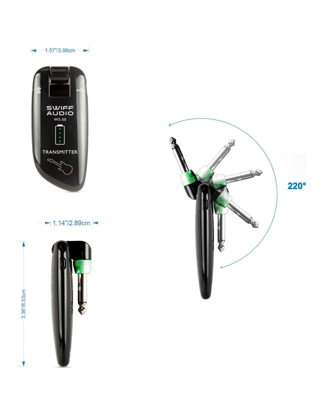 Batería de litio recargable de 600mAh incorporada, uso sostenible por más de 5 horas (una carga completa necesita 3 horas). Se incluye un cable USB de doble extremo. Además, doble clic, verifica la potencia actual de la batería, fácil operación. Alcanzando un rango de transmisión inalámbrica de 164ft (50m), sin pérdida de señal y sin retraso (al aire libre, sin obstáculos). Alta Tasa de Muestreo (24bit/48Khz) hace que la salida de sonido sea más representativa. Múltiples Canales para múltiples dispositivos, hay 10 canales opcionales cada vez que enciendes el dispositivo. Adopta tecnología UHF, soporta más equipos usando simultáneamente con fuerte capacidad de anti-interferencia. SWIFF AUDIO es una empresa profesional con I+D, fabricación, venta y servicio que se ocupa exclusivamente de productos para instrumentos musicales y accesorios durante 11 años. Insistir en la Calidad, Enfocarse en los Detalles, Valorar a Nuestros Clientes son lo que SWIFF AUDIO persigue. Los productos que desarrollamos y producimos incluyen sistemas de guitarra inalámbricos, afinadores, micrófonos inalámbricos, capos, soportes para guitarra y otros instrumentos y accesorios. Todos los productos son de buena calidad y asequibles.