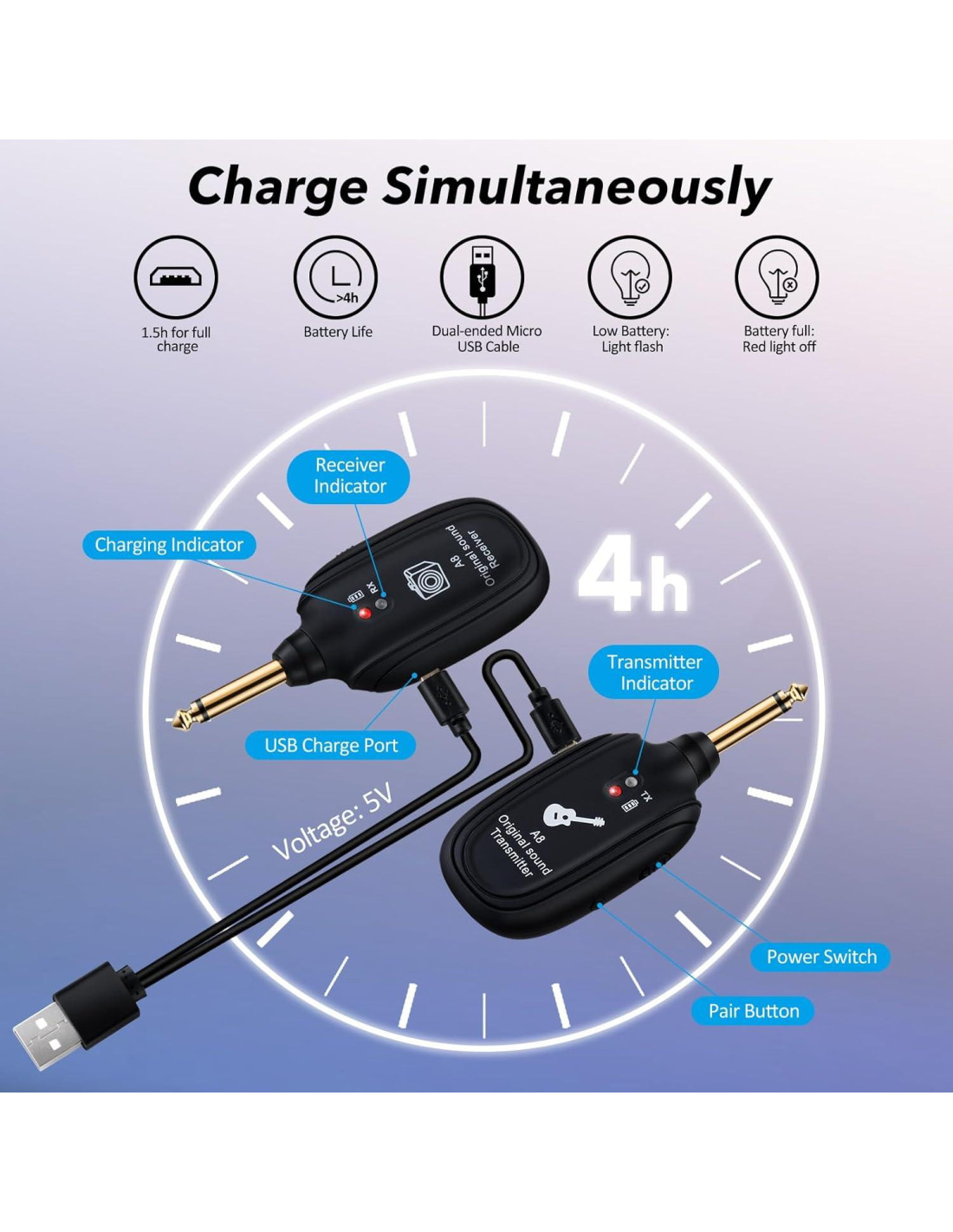 - 4. Configuración Simple Plug-and-Play para un Rendimiento Sin Esfuerzo. Configurar tu sistema de guitarra inalámbrica es tan simple como presionar un botón. El sistema de emparejamiento de un botón sincroniza el transmisor y el receptor rápida y fácilmente, para que puedas comenzar a tocar sin complicaciones. También soporta múltiples canales para un uso libre de interferencias durante ensayos o actuaciones, convirtiéndolo en un elemento imprescindible para músicos y guitarristas ocupados.