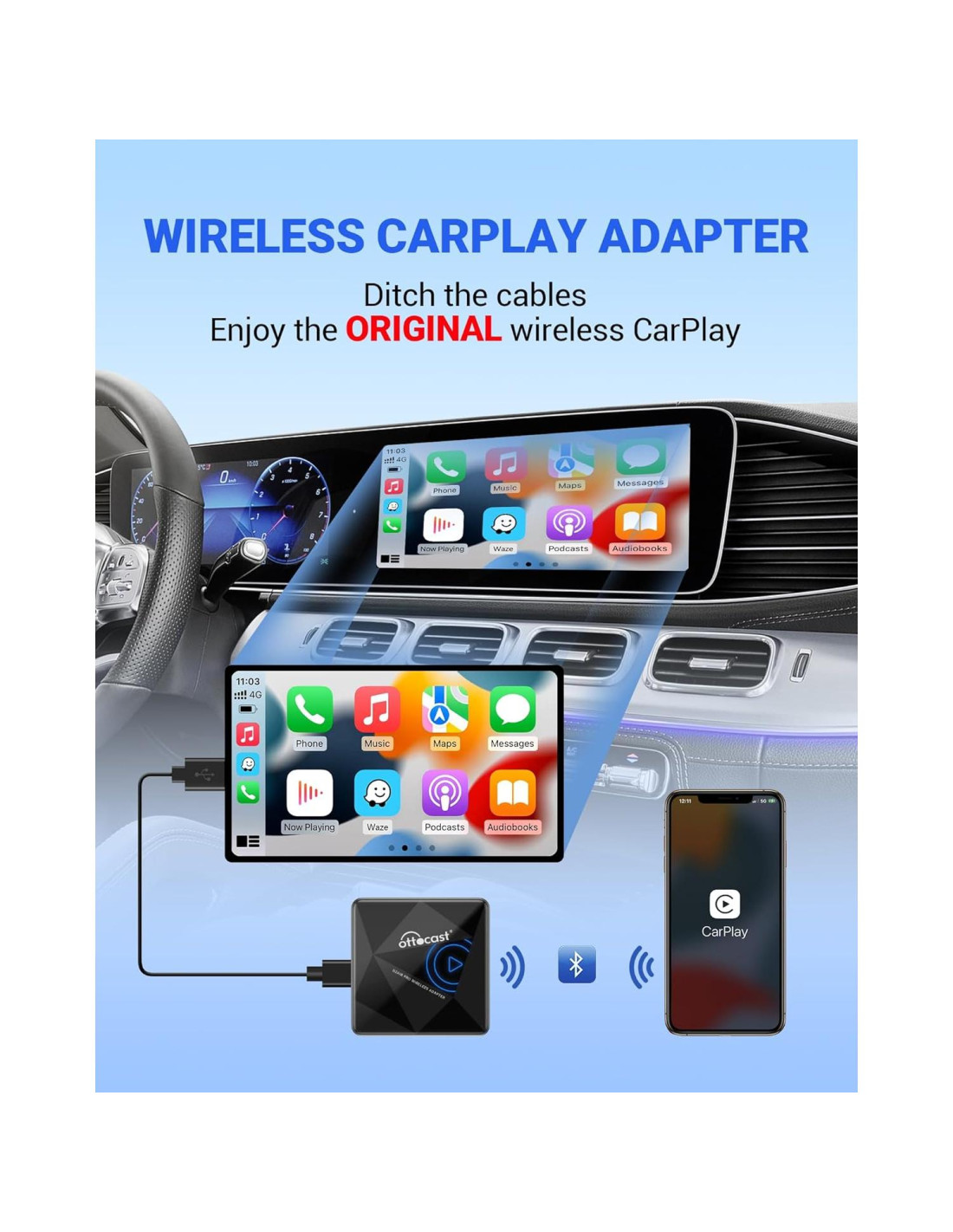 - [Actualiza a CarPlay Inalámbrico] Actualiza fácilmente a CarPlay inalámbrico con el Adaptador Wireless CarPlay de OTTOCAST. Diseñado para autos con CarPlay por cable de fábrica, ofrece una solución asequible y sin complicaciones para cambiar a CarPlay inalámbrico. Nota: No compatible con BMW, Tesla, y no soporta convertir Android Auto por cable a inalámbrico.