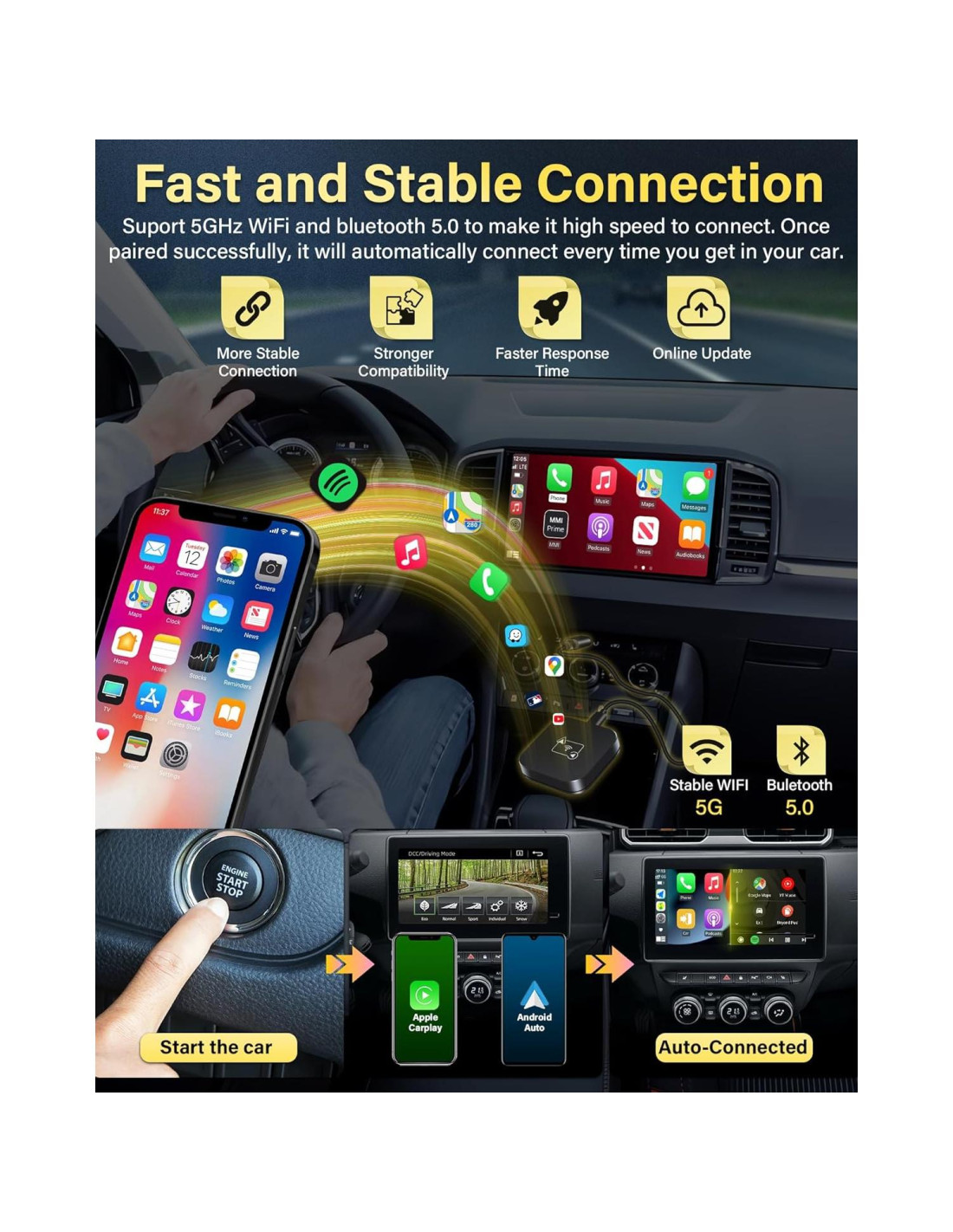 - [Rápido y Estable] El adaptador carplay inalámbrico tiene un chip WIFI de 5Ghz incorporado con velocidad de procesamiento rápida y es compatible con la tasa WIFI de 5Ghz, lo que hace que la conexión sea más estable y receptiva sin retraso de audio. El adaptador android auto inalámbrico solo necesita esperar de 5 a 15 segundos para acceder fácilmente a tus aplicaciones móviles en la pantalla de apple carplay para el coche, proporcionando la experiencia sensorial definitiva! No es necesario enchufar y desenchufar el cable de apple carplay, y no hay necesidad de preocuparse por desconexiones repentinas!