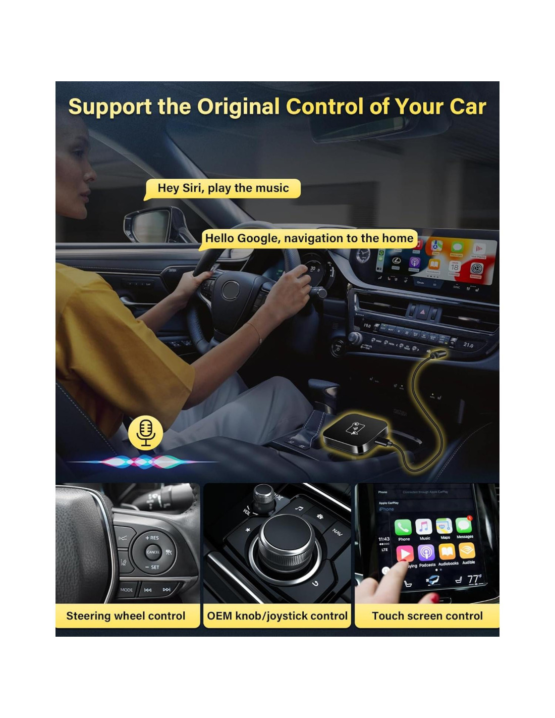- [Adaptador Inalámbrico Mini Inteligente Carplay] Con el adaptador carPlay y android auto inalámbrico, puedes usar tu voz para controlar tu coche, acceder fácilmente a una variedad de aplicaciones de música, encontrar mapas y rutas para navegar de forma segura, hacer llamadas telefónicas y más, liberando tus manos y haciendo que la experiencia de conducción sea más agradable. Mientras tanto, el mejor adaptador carplay inalámbrico para iphone también soporta control de volante, control por botones y control de pantalla táctil